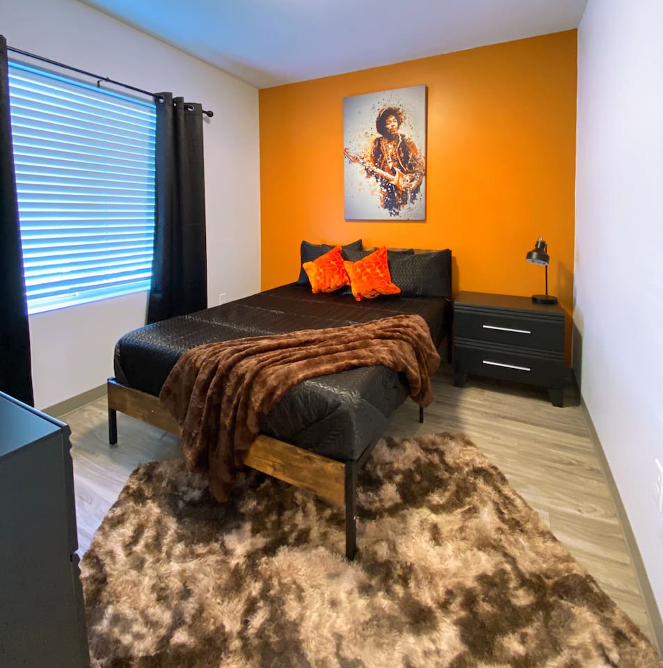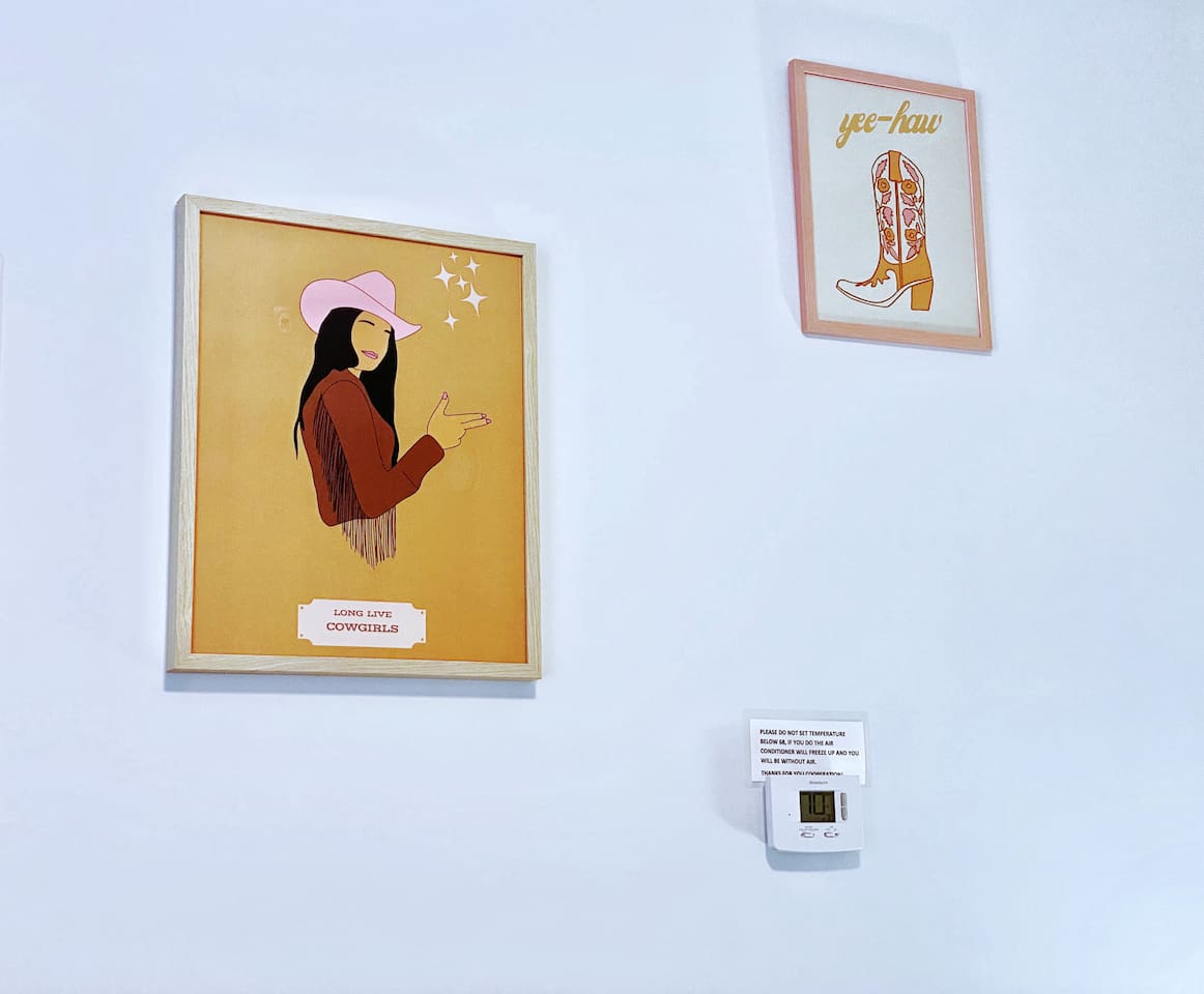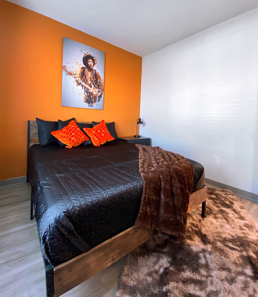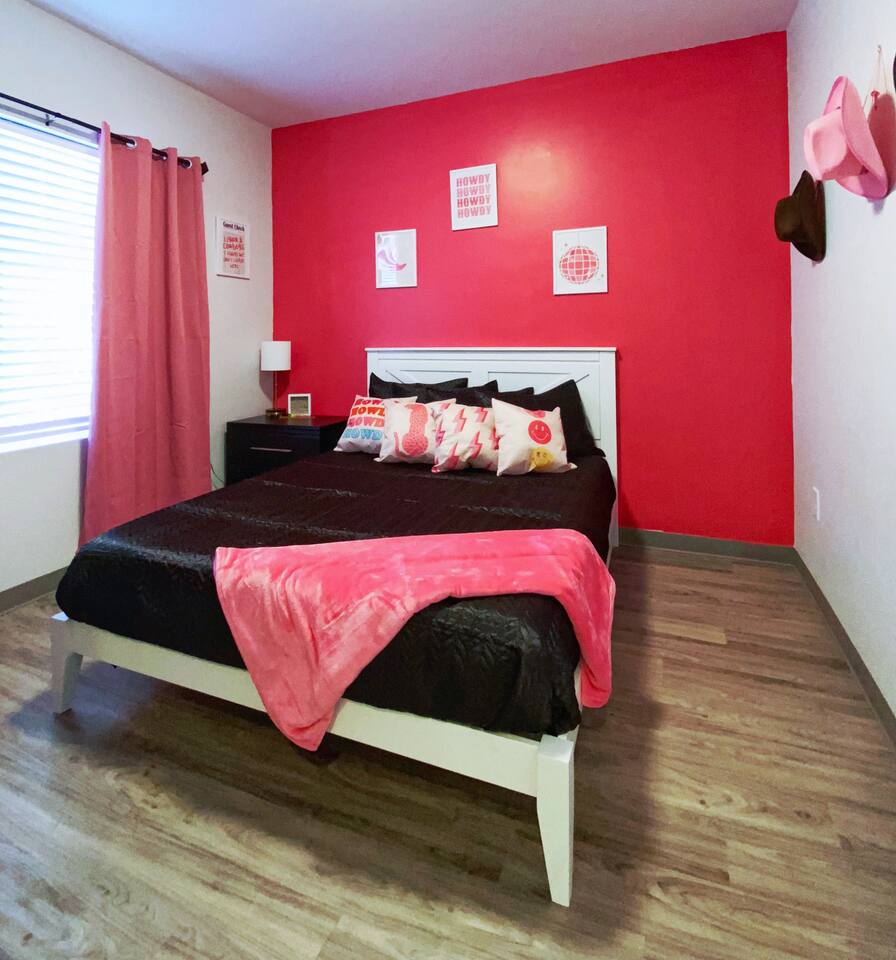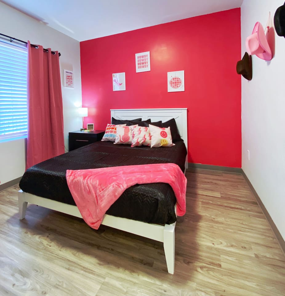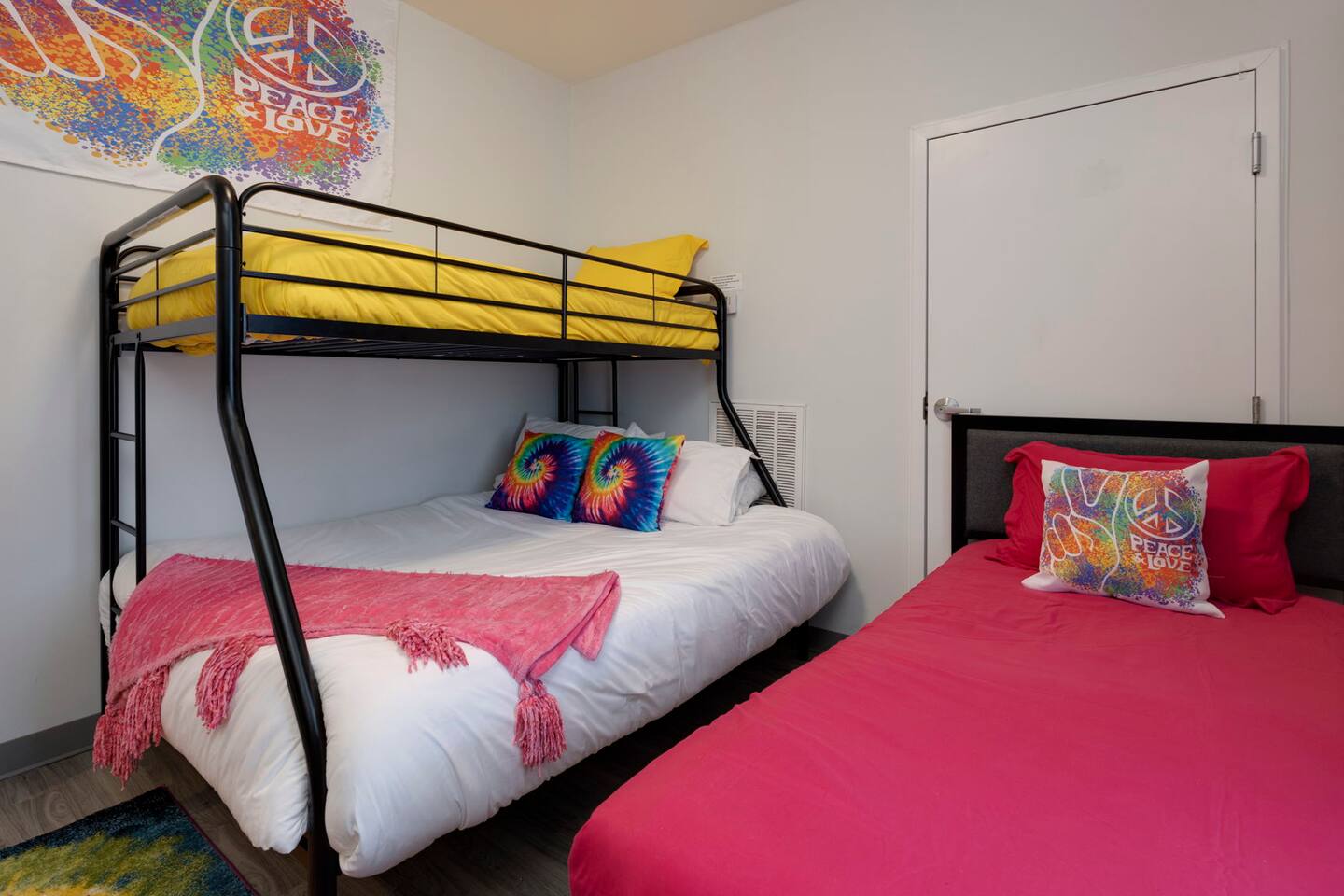 The "Giddy Up" Suite: Giddy Up Cowgirls (and boys)! We love to keep it country. Come take selfies on the saddle, enjoy the vibrant colors + bright space in all 4 rooms! ->Bedroom 1 "Cowboys + Tequila Please" : twin bunk beds | 1 single bunk ->Bedroom 2 "Giddy Up Cowgirl": Queen memory foam bed ->Bedroom 3 "Cowgirl Up" : Queen memory foam bed ->Bedroom 4 "Disco Cowgirl in Pink" : Queen memory foam bed *all bedrooms have smart tvs, alarm clocks (who needs em tho, right??), noise machines for that extra comfortable sleep *living area and select bedrooms have cable tv *kitchenette's have the perfect mini kitchen for your stay including; an oven, stovetop, dishwasher, fridge + most importantly.. a coffee maker:) *both bathrooms are shower only, no tubs *linens, towels, its all provided <-this is a THIRD floor unit, there are stairs-> __________________ The "Hippy Haven" Suite: Woodstock meets Hippy and makes a haven for you to relax + enjoy in! ->Bedroom 1 - " Tye Dyed in Peace": 1 twin bunk bed, 1 queen bunk | 1 single bunk ->Bedroom 2 - "Jimi" : Queen memory foam bed ->Bedroom 3 - "Janis Joplin" : Queen memory foam bed ->Bedroom 4 - "Woodstock Icons" : 2 twin beds *all bedrooms have smart tvs, alarm clocks (who needs em tho, right??), noise machines for that extra comfortable sleep *living area and select bedrooms have cable tv *kitchenette's have the perfect mini kitchen for your stay including; an oven, stovetop, dishwasher, fridge + most importantly.. a coffee maker:) *both bathrooms are shower only, no tubs *linens, towels, its all provided <-this is a THIRD floor unit, there are stairs->