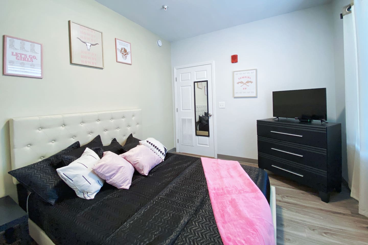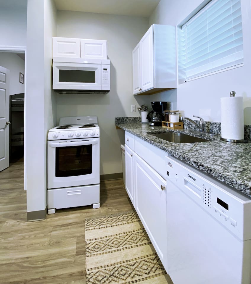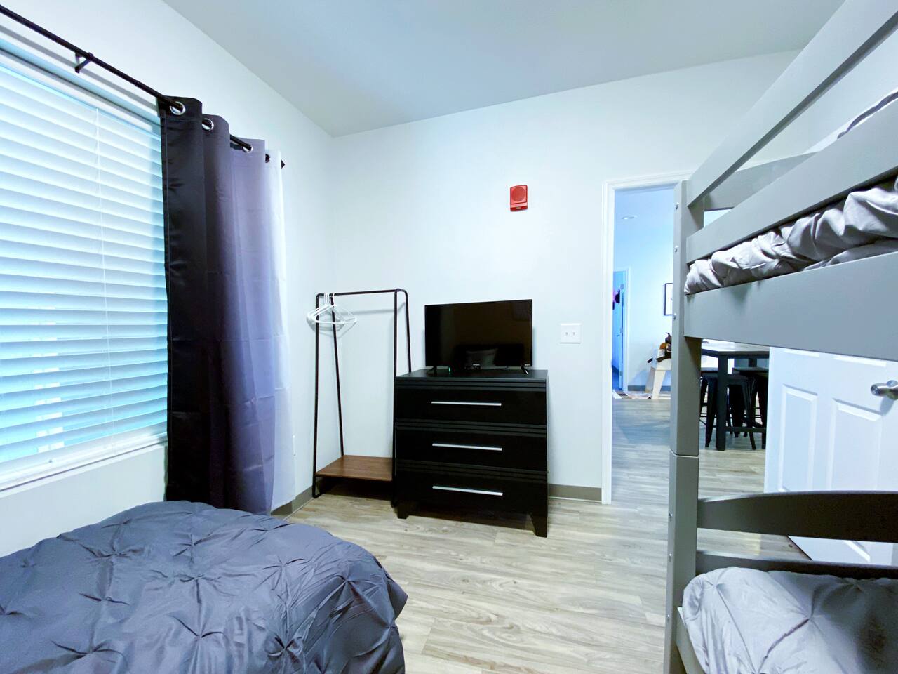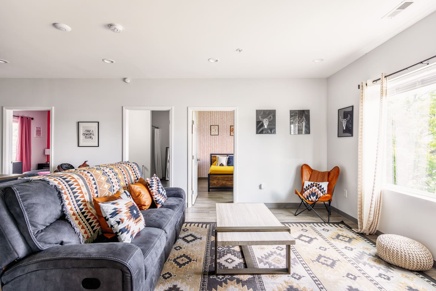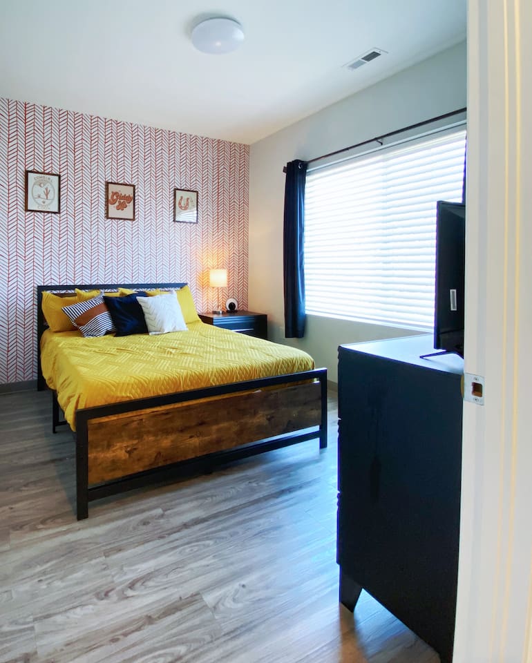 The "Giddy Up" Suite: Giddy Up Cowgirls (and boys)! We love to keep it country. Come take selfies on the saddle, enjoy the vibrant colors + bright space in all 4 rooms! ->Bedroom 1 "Cowboys + Tequila Please" : twin bunk beds | 1 single bunk ->Bedroom 2 "Giddy Up Cowgirl": Queen memory foam bed ->Bedroom 3 "Cowgirl Up" : Queen memory foam bed ->Bedroom 4 "Disco Cowgirl in Pink" : Queen memory foam bed *all bedrooms have smart tvs, alarm clocks (who needs em tho, right??), noise machines for that extra comfortable sleep *living area and select bedrooms have cable tv *kitchenette's have the perfect mini kitchen for your stay including; an oven, stovetop, dishwasher, fridge + most importantly.. a coffee maker:) *both bathrooms are shower only, no tubs *linens, towels, its all provided <-this is a THIRD floor unit, there are stairs-> __________________ The "Hippy Haven" Suite: Woodstock meets Hippy and makes a haven for you to relax + enjoy in! ->Bedroom 1 - " Tye Dyed in Peace": 1 twin bunk bed, 1 queen bunk | 1 single bunk ->Bedroom 2 - "Jimi" : Queen memory foam bed ->Bedroom 3 - "Janis Joplin" : Queen memory foam bed ->Bedroom 4 - "Woodstock Icons" : 2 twin beds *all bedrooms have smart tvs, alarm clocks (who needs em tho, right??), noise machines for that extra comfortable sleep *living area and select bedrooms have cable tv *kitchenette's have the perfect mini kitchen for your stay including; an oven, stovetop, dishwasher, fridge + most importantly.. a coffee maker:) *both bathrooms are shower only, no tubs *linens, towels, its all provided <-this is a THIRD floor unit, there are stairs->