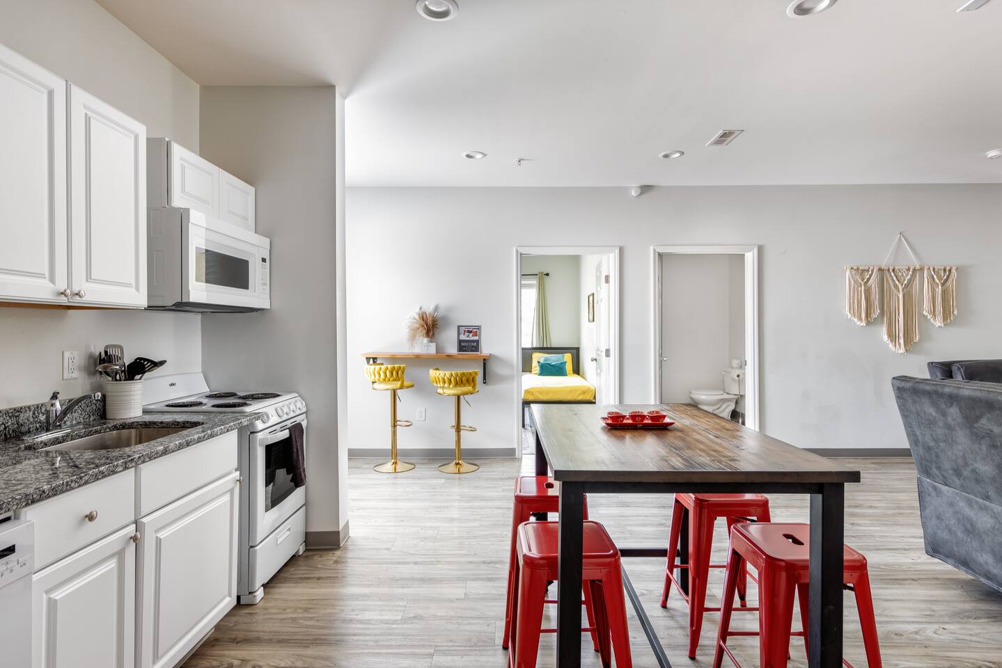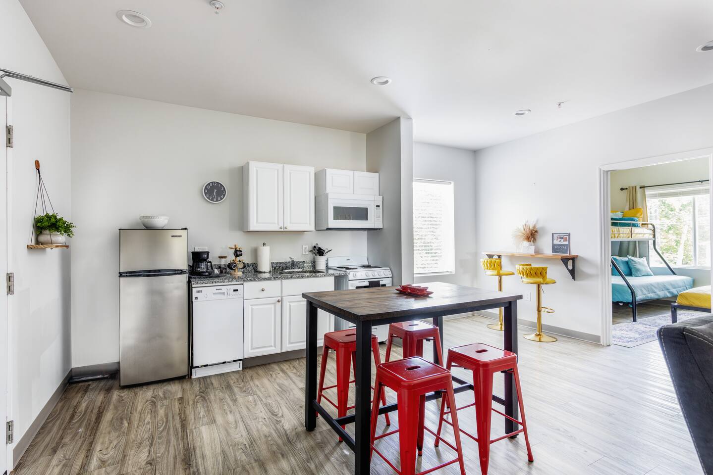 Southern Charm meets Boho dreams! Bright colors, bohemian vibes + a relaxing place to call home.. The Suite: ->Bedroom 1: twin bunk beds | 1 single bunk ->Bedroom 2: Queen memory foam bed ->Bedroom 3: Queen memory foam bed ->Bedroom 4: 2 twin beds *all bedrooms have smart tvs, alarm clocks (who needs em tho, right??), noise machines for that extra comfortable sleep *living area and select bedrooms have cable tv *kitchenette's have the perfect mini kitchen for your stay including; an oven, stovetop, dishwasher, fridge + most importantly.. a coffee maker:) *both bathrooms are shower only, no tubs *linens, towels, its all provided <-this is a SECOND floor unit, there are stairs-> DISCLAIMER: -Additional guests outside of your confirmed guest count are not allowed on our property + go against your rental agreement. -We have a zero tolerance policy on our property being used for ANY kind of loud gathering or party. We have cameras + security. Per your rental agreement this is grounds for eviction without question or refund + possible legal action. -Upon confirming your booking, you are subject to our House Rules, Rental Agreement which you sign and/or enter it upon checking in, which includes this disclaimer + much more. *NO LOCALS ALLOWED TO BOOK ANY OF OUR PROPERTIES, YOU WILL BE CANCELLED*
