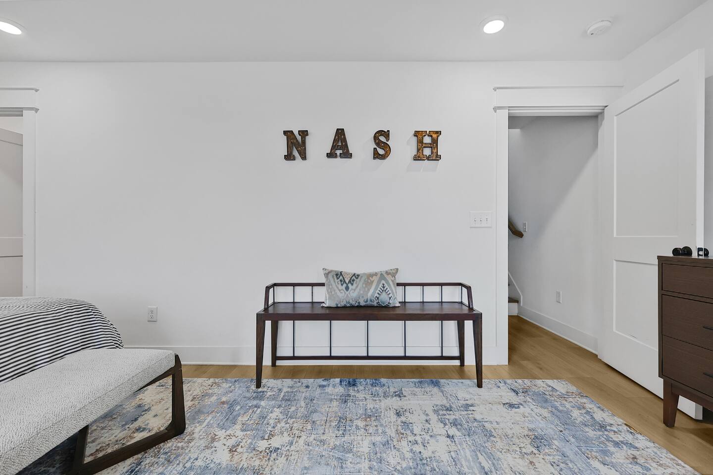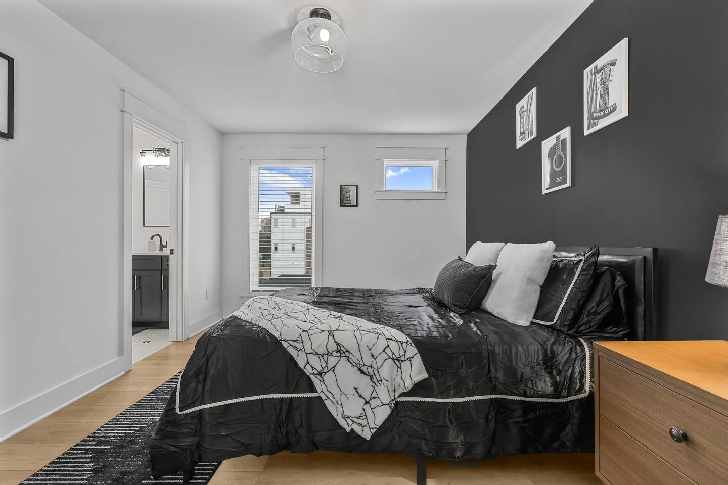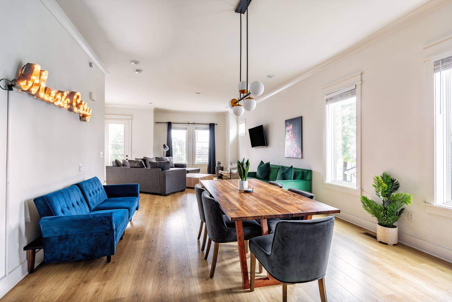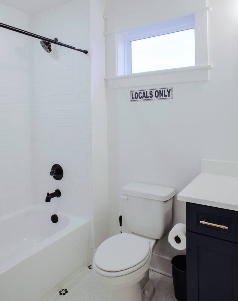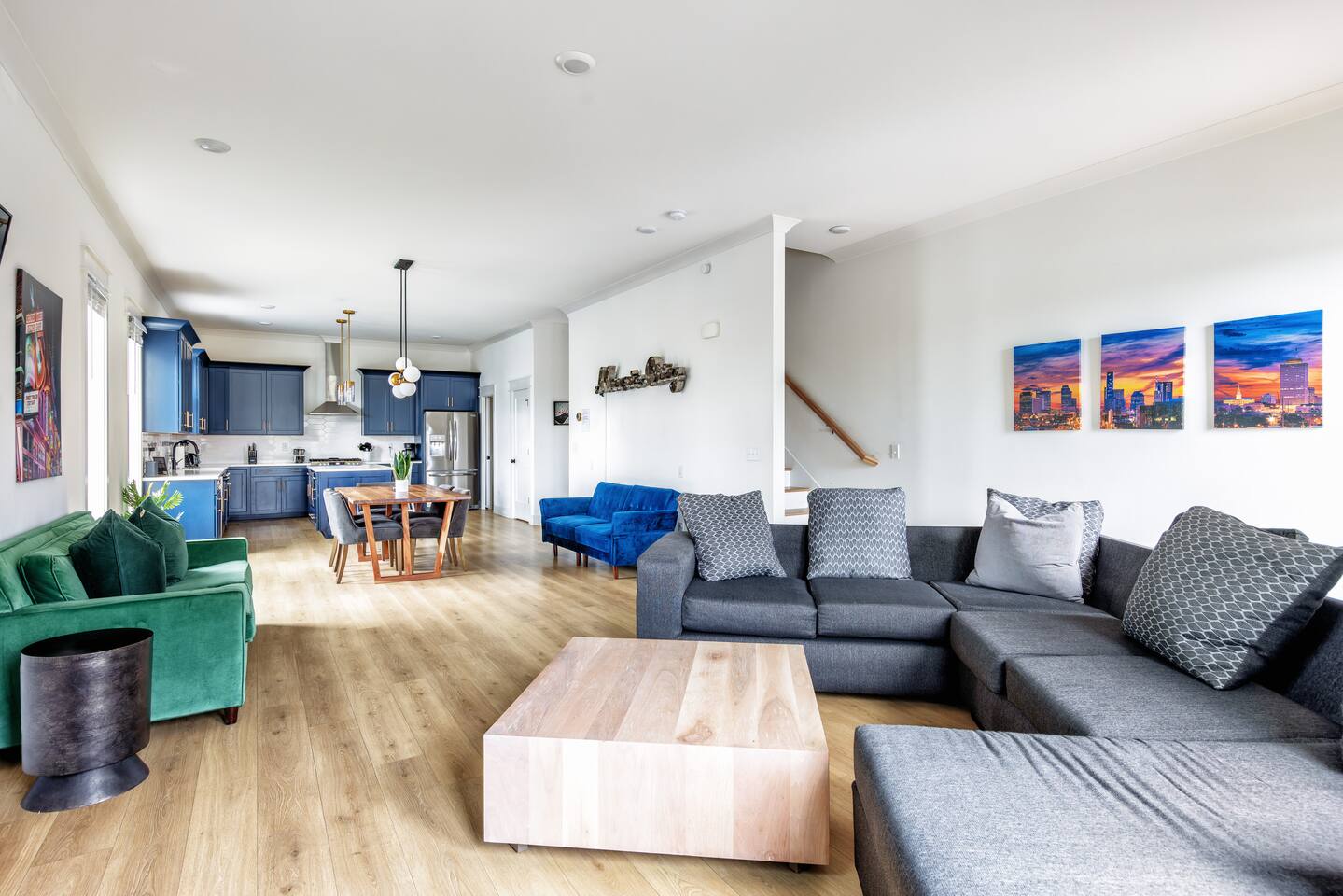 The artwork in the unit is all local artists! We love to support our friends and community. ✔️The first floor has two queen bedrooms and one bath. ✔️Take the flight of stairs up to the main quarters and you’ll find a fully equipped chefs kitchen, a six person designer wood table to dine, and an expansive living area. ✔️Take the next flight of stairs up to the third-floor where you will find a queen bedroom with a bathroom, a king master with an en suite bathroom. ✔️Take some selfie‘s or group photos in front of our Nashville selfie wall! ✔️Enjoy the rooftop feels and views as you make your way to the fourth floor. Here you can enjoy a game of cod hole or ring toss!