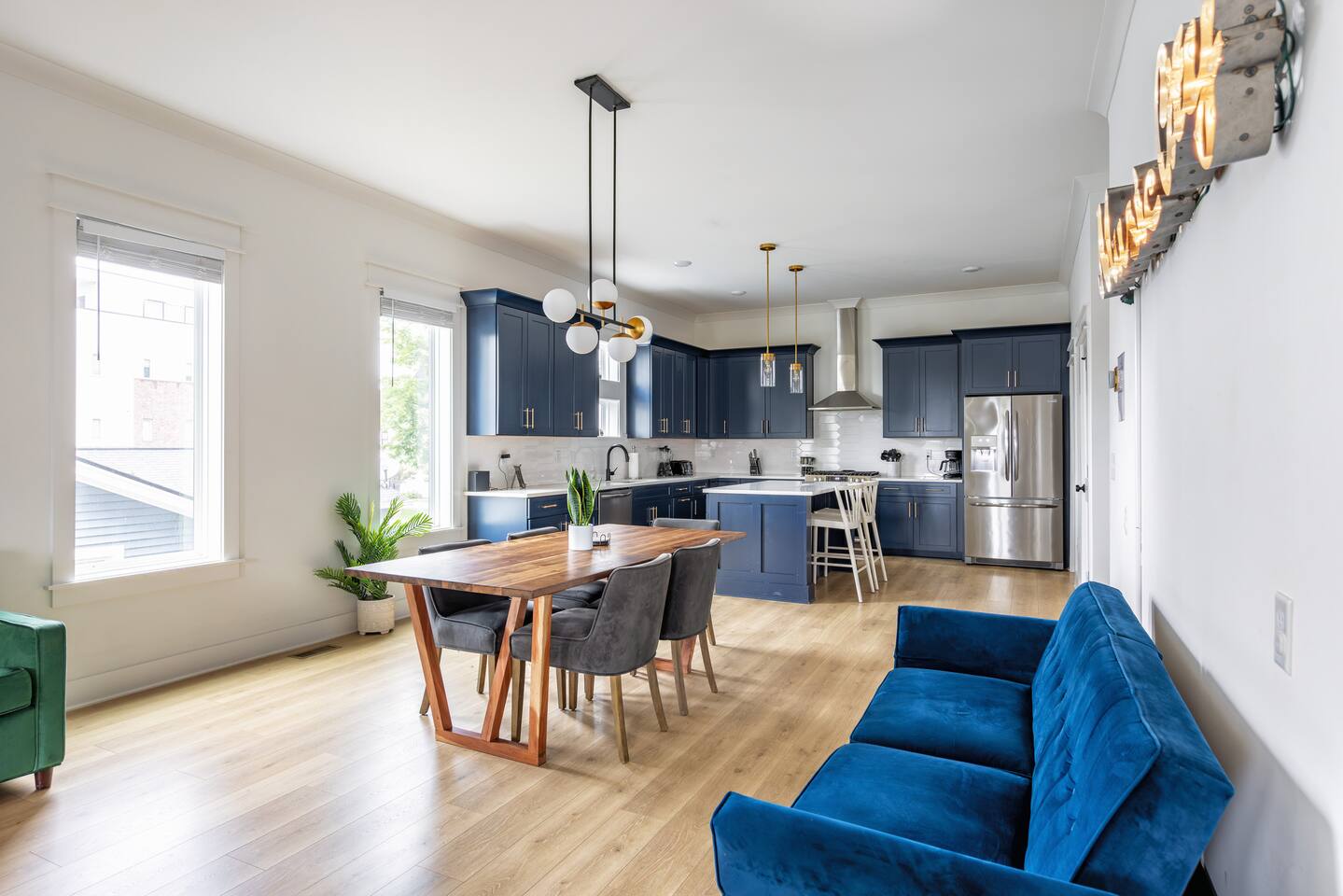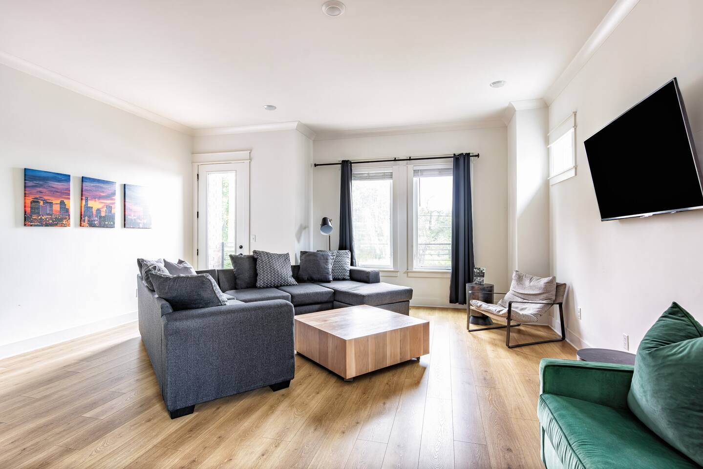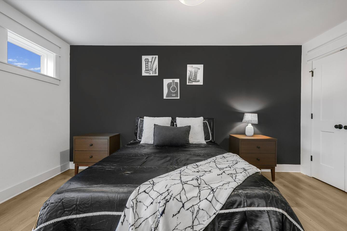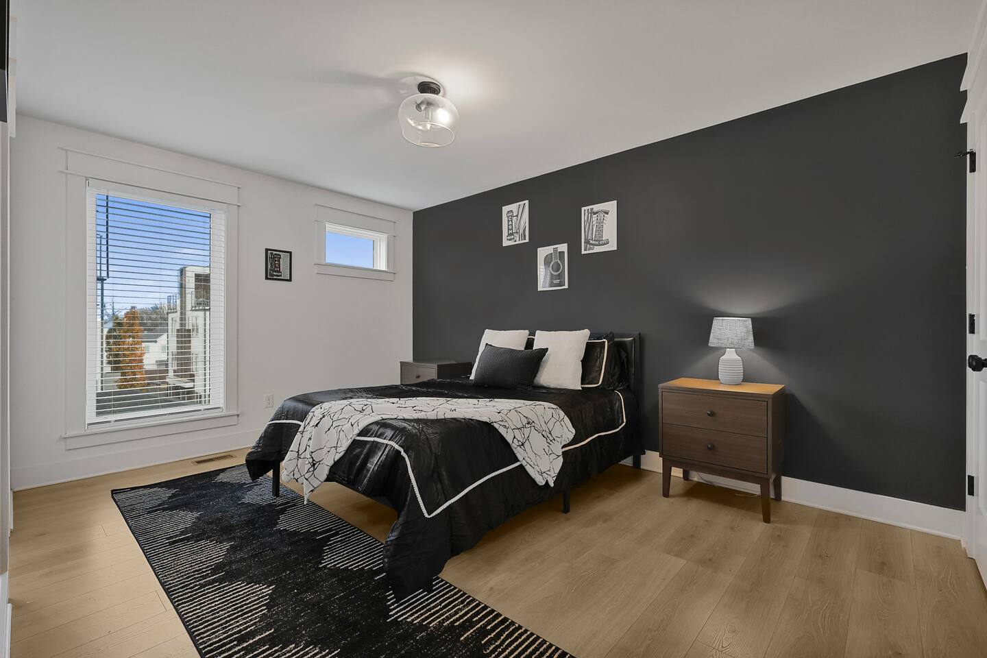 The artwork in the unit is all local artists! We love to support our friends and community. ✔️The first floor has two queen bedrooms and one bath. ✔️Take the flight of stairs up to the main quarters and you’ll find a fully equipped chefs kitchen, a six person designer wood table to dine, and an expansive living area. ✔️Take the next flight of stairs up to the third-floor where you will find a queen bedroom with a bathroom, a king master with an en suite bathroom. ✔️Take some selfie‘s or group photos in front of our Nashville selfie wall! ✔️Enjoy the rooftop feels and views as you make your way to the fourth floor. Here you can enjoy a game of cod hole or ring toss!
