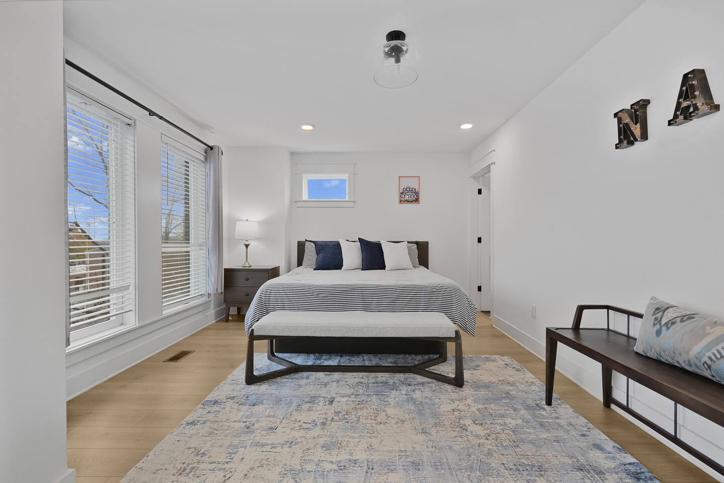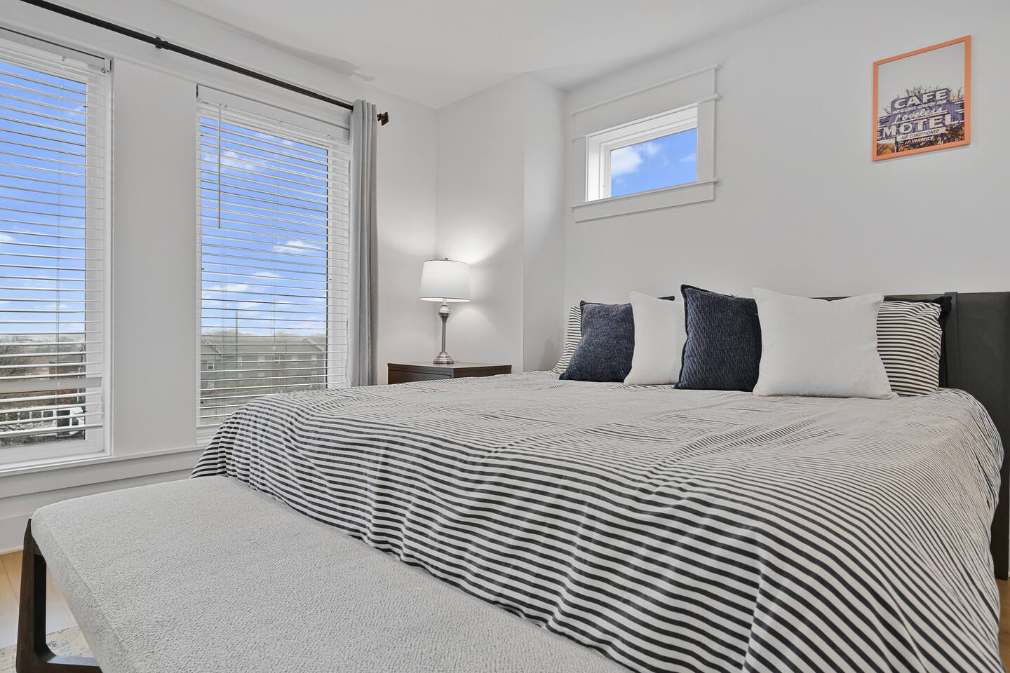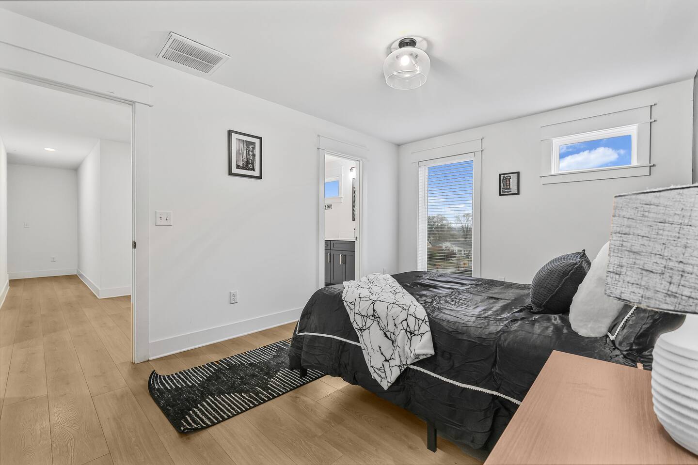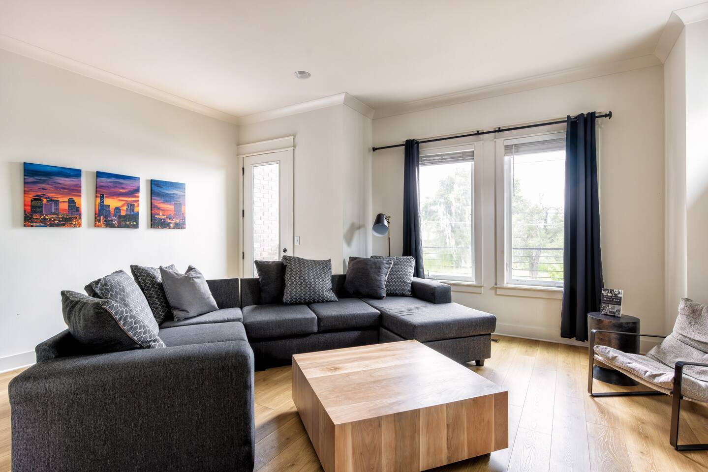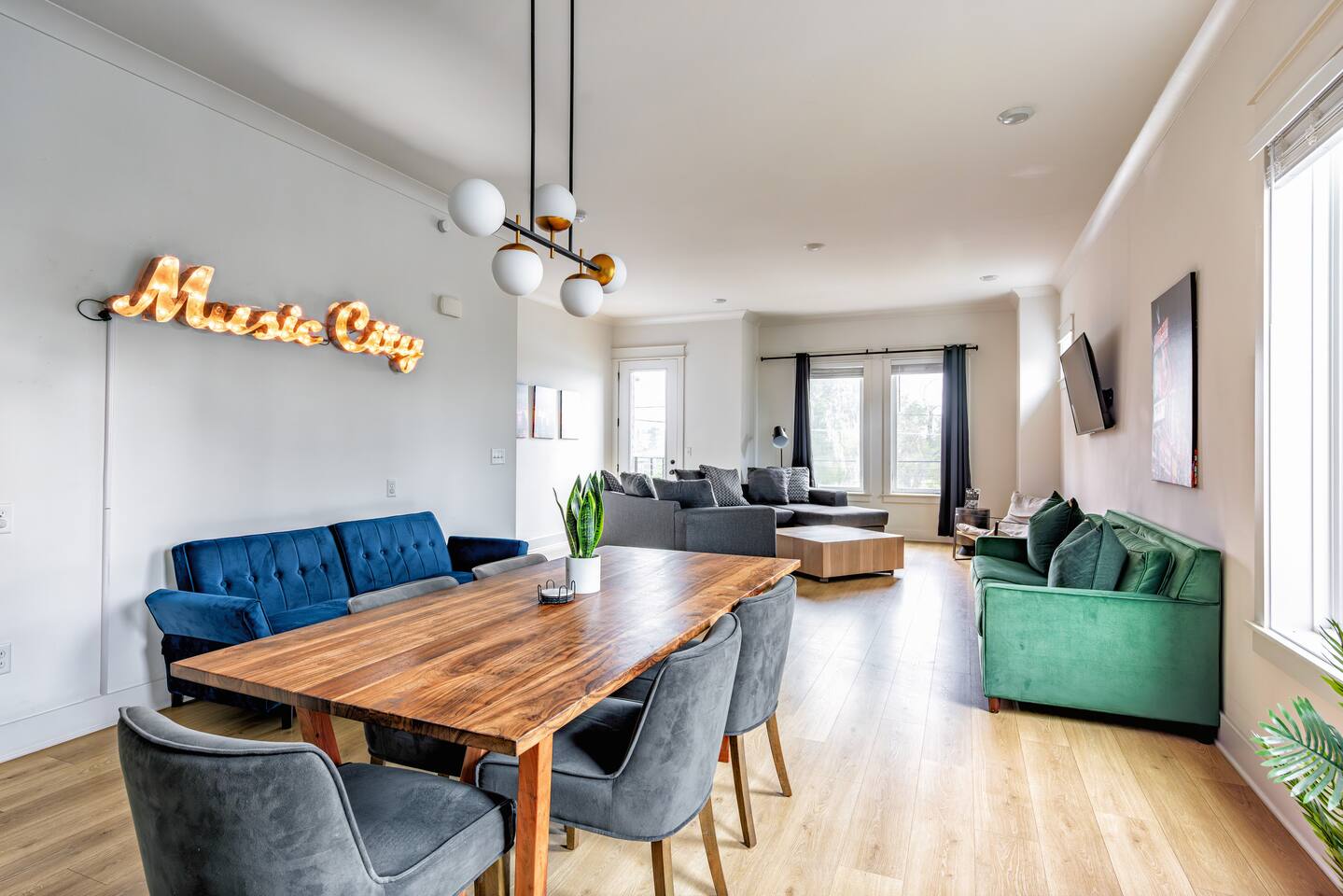 The artwork in the unit is all local artists! We love to support our friends and community. ✔️The first floor has two queen bedrooms and one bath. ✔️Take the flight of stairs up to the main quarters and you’ll find a fully equipped chefs kitchen, a six person designer wood table to dine, and an expansive living area. ✔️Take the next flight of stairs up to the third-floor where you will find a queen bedroom with a bathroom, a king master with an en suite bathroom. ✔️Take some selfie‘s or group photos in front of our Nashville selfie wall! ✔️Enjoy the rooftop feels and views as you make your way to the fourth floor. Here you can enjoy a game of cod hole or ring toss!