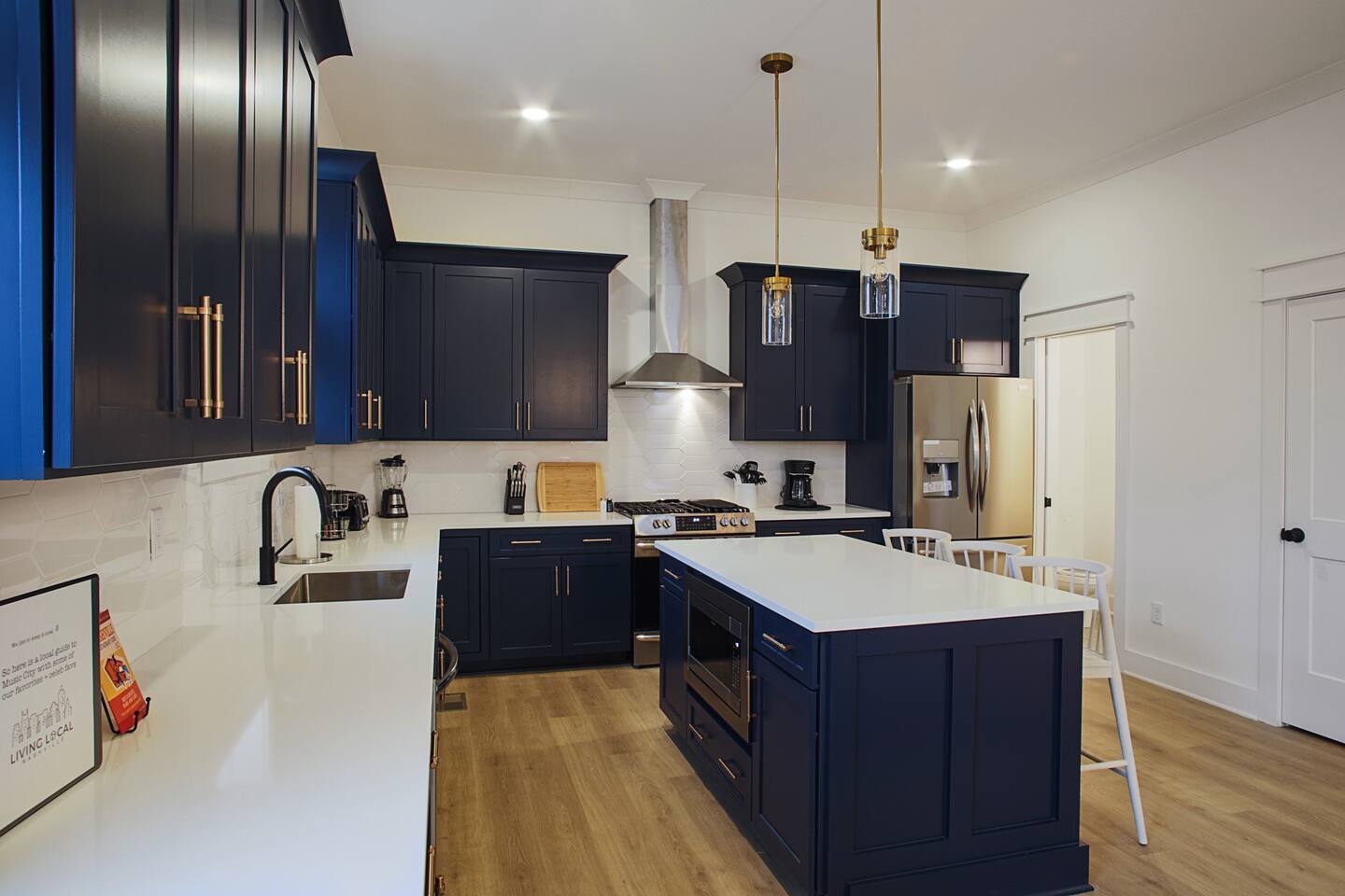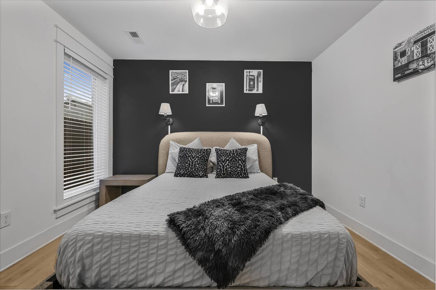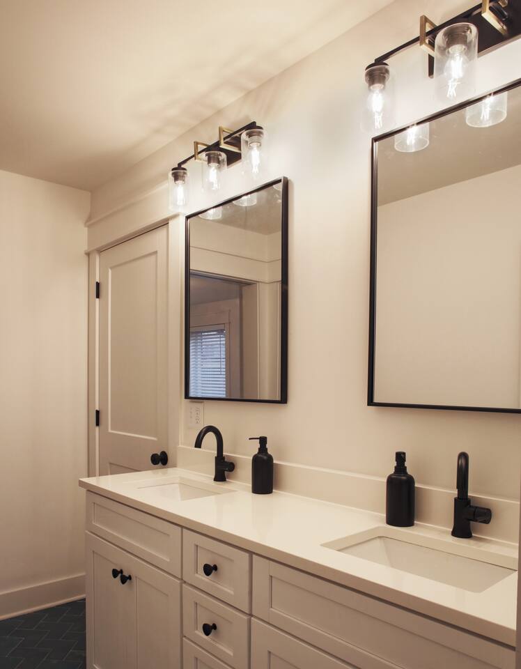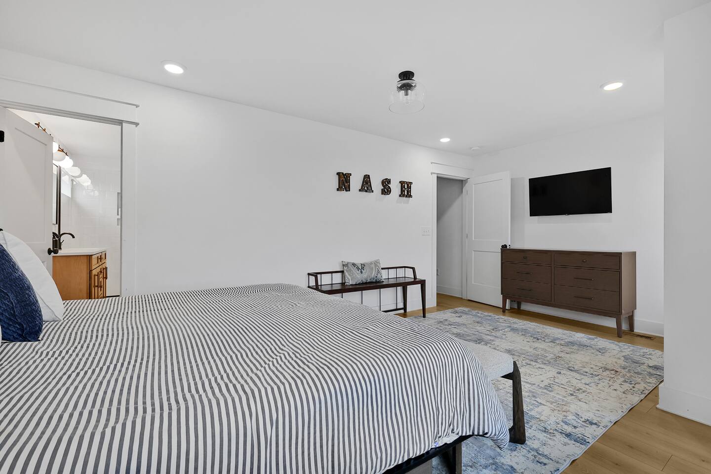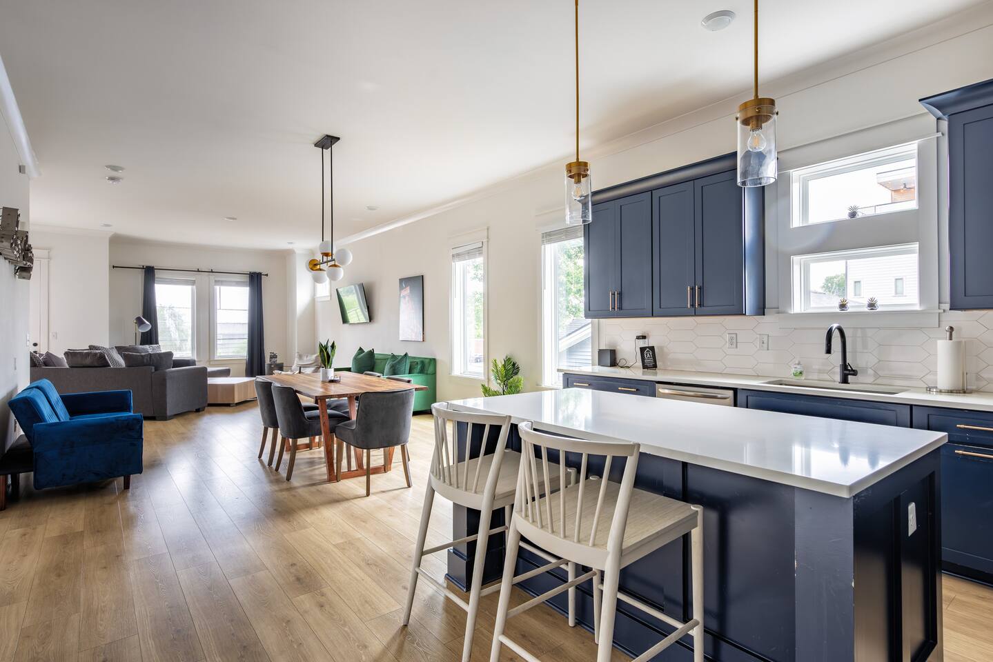 The artwork in the unit is all local artists! We love to support our friends and community. ✔️The first floor has two queen bedrooms and one bath. ✔️Take the flight of stairs up to the main quarters and you’ll find a fully equipped chefs kitchen, a six person designer wood table to dine, and an expansive living area. ✔️Take the next flight of stairs up to the third-floor where you will find a queen bedroom with a bathroom, a king master with an en suite bathroom. ✔️Take some selfie‘s or group photos in front of our Nashville selfie wall! ✔️Enjoy the rooftop feels and views as you make your way to the fourth floor. Here you can enjoy a game of cod hole or ring toss!