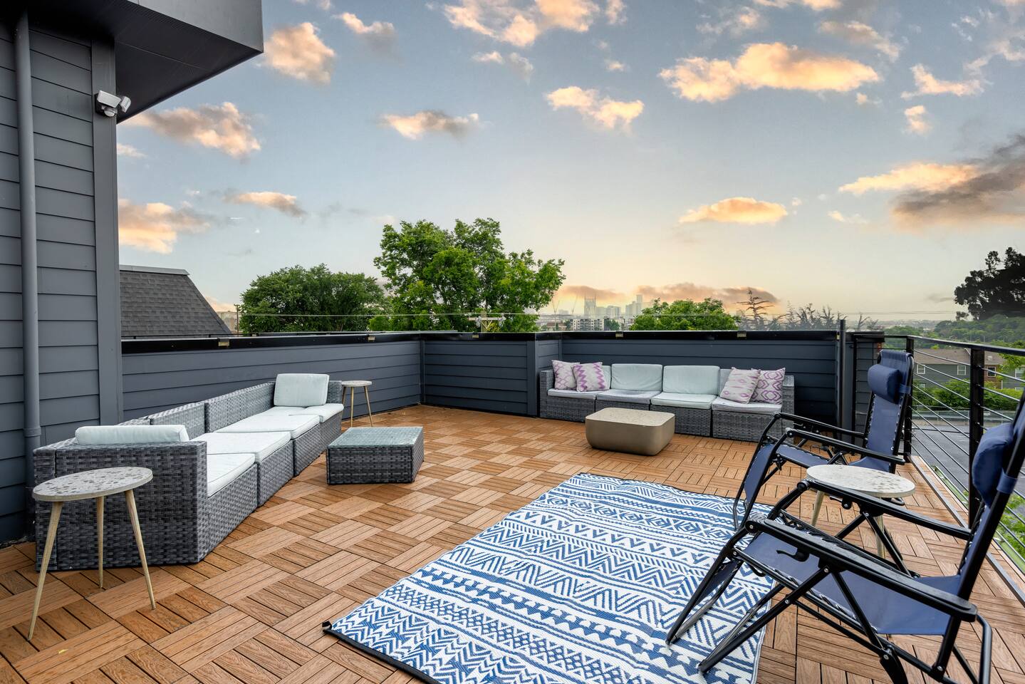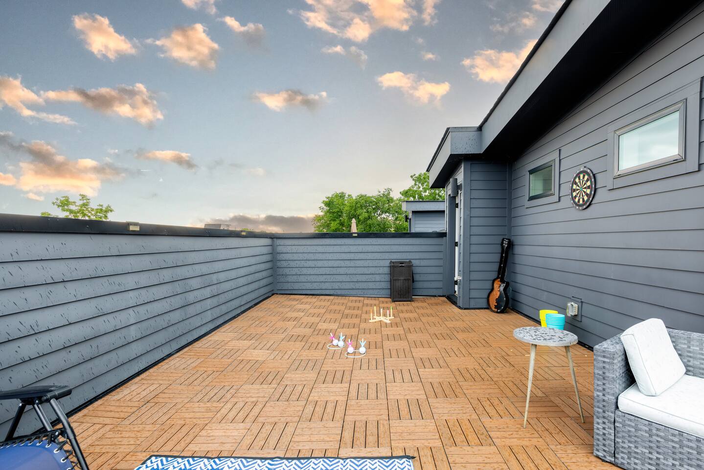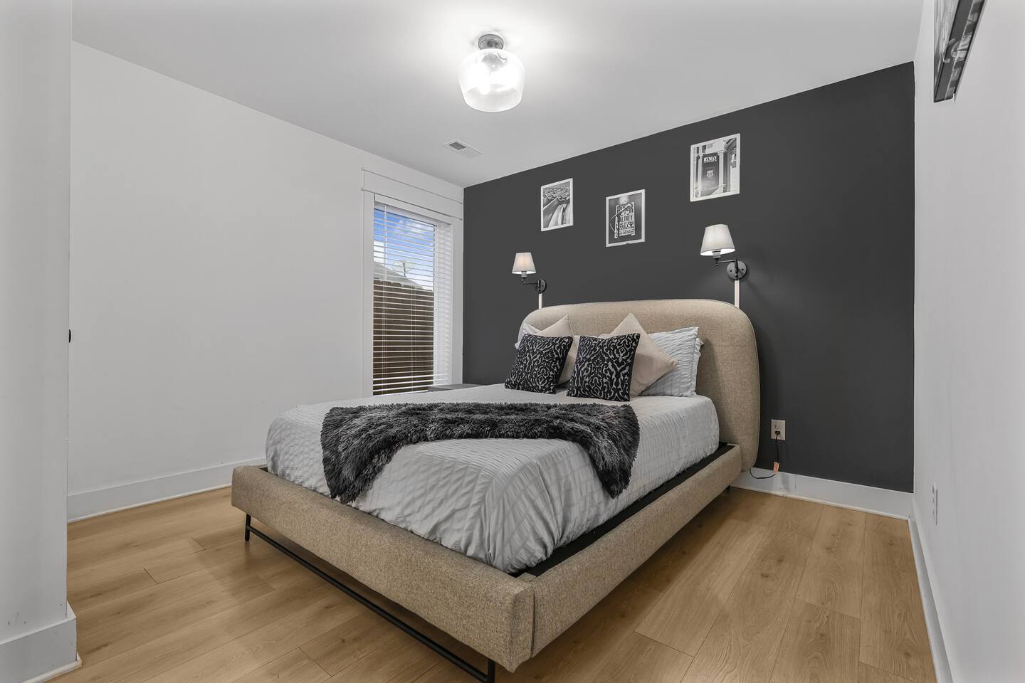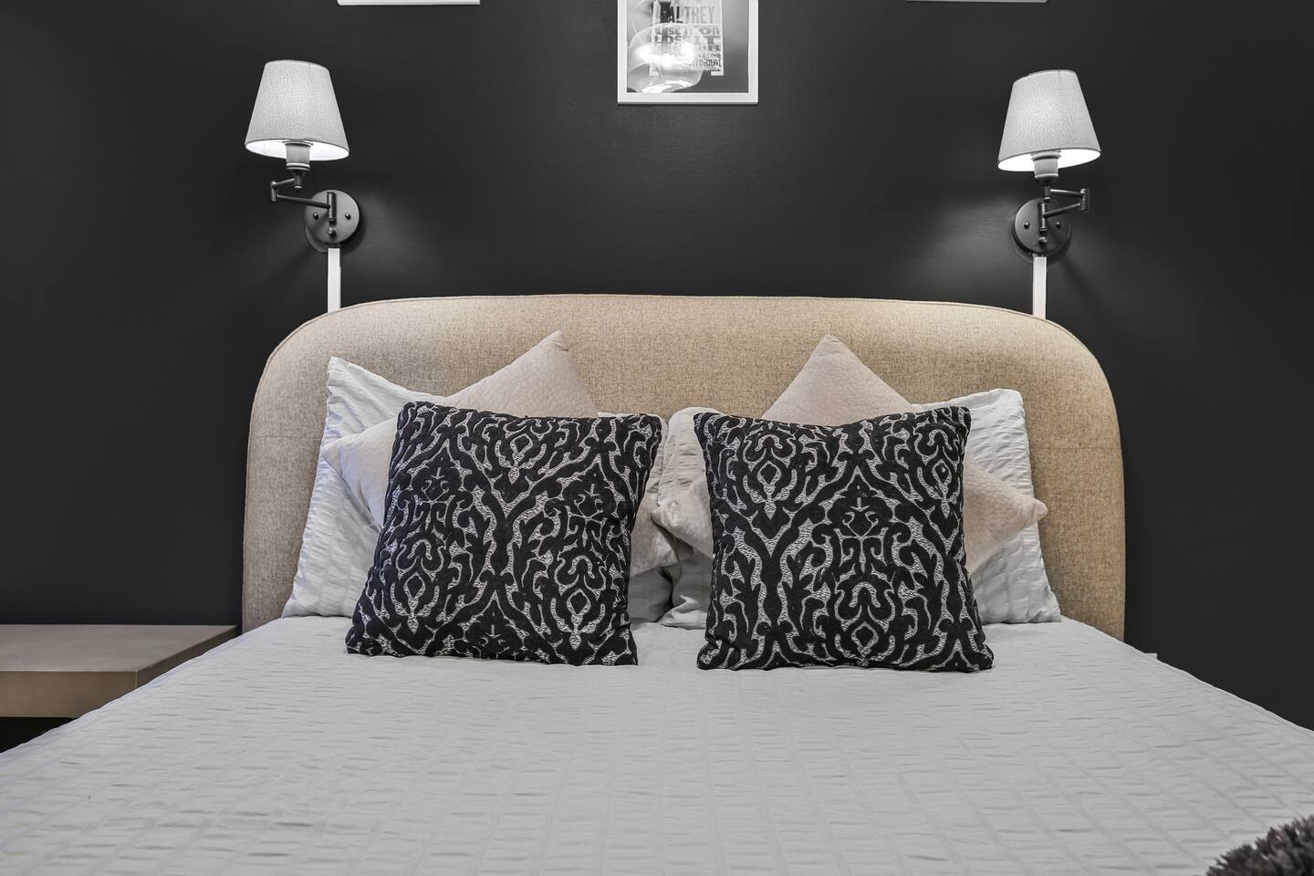 The artwork in the unit is all local artists! We love to support our friends and community. ✔️The first floor has two queen bedrooms and one bath. ✔️Take the flight of stairs up to the main quarters and you’ll find a fully equipped chefs kitchen, a six person designer wood table to dine, and an expansive living area. ✔️Take the next flight of stairs up to the third-floor where you will find a queen bedroom with a bathroom, a king master with an en suite bathroom. ✔️Take some selfie‘s or group photos in front of our Nashville selfie wall! ✔️Enjoy the rooftop feels and views as you make your way to the fourth floor. Here you can enjoy a game of cod hole or ring toss!
