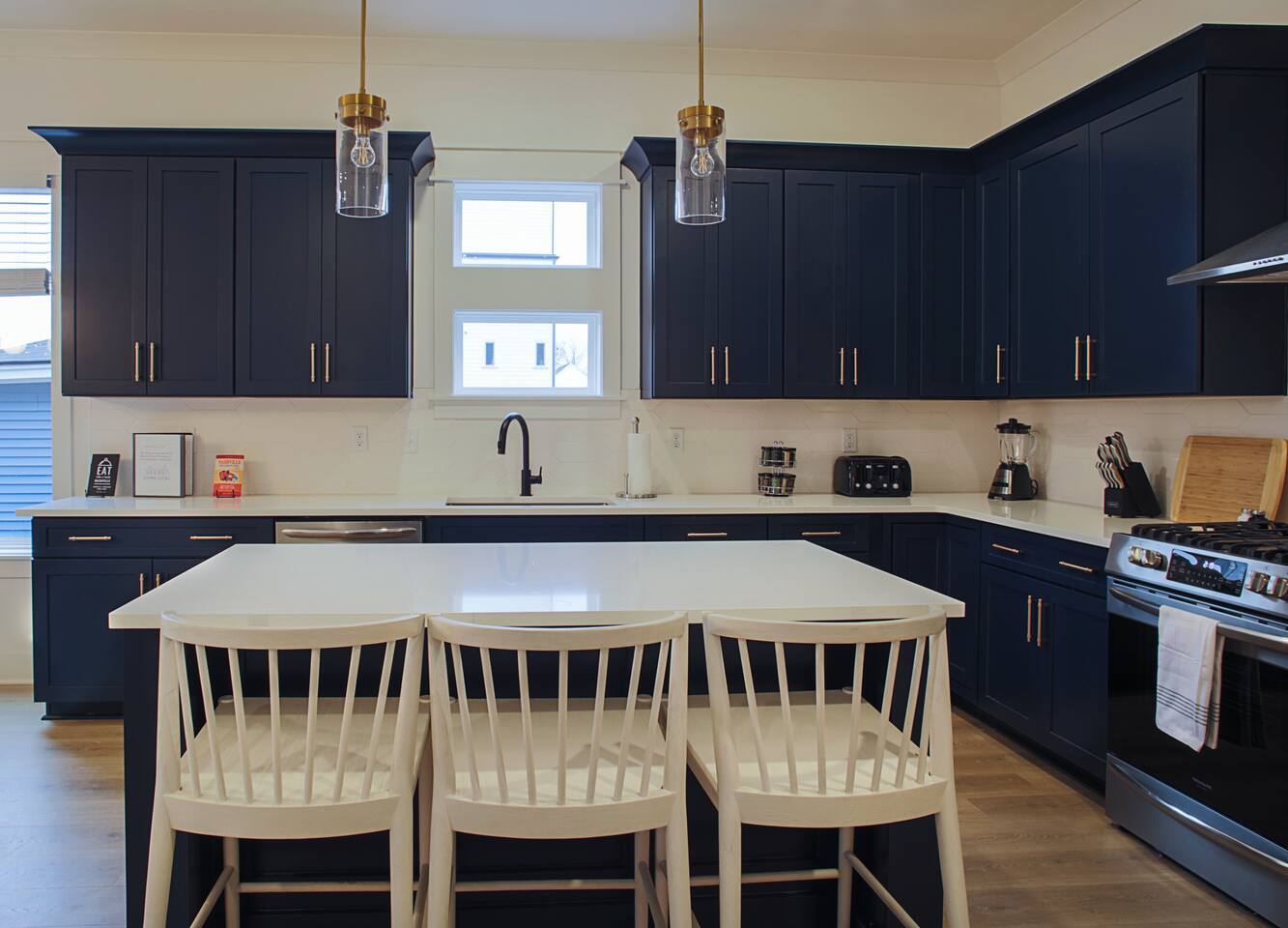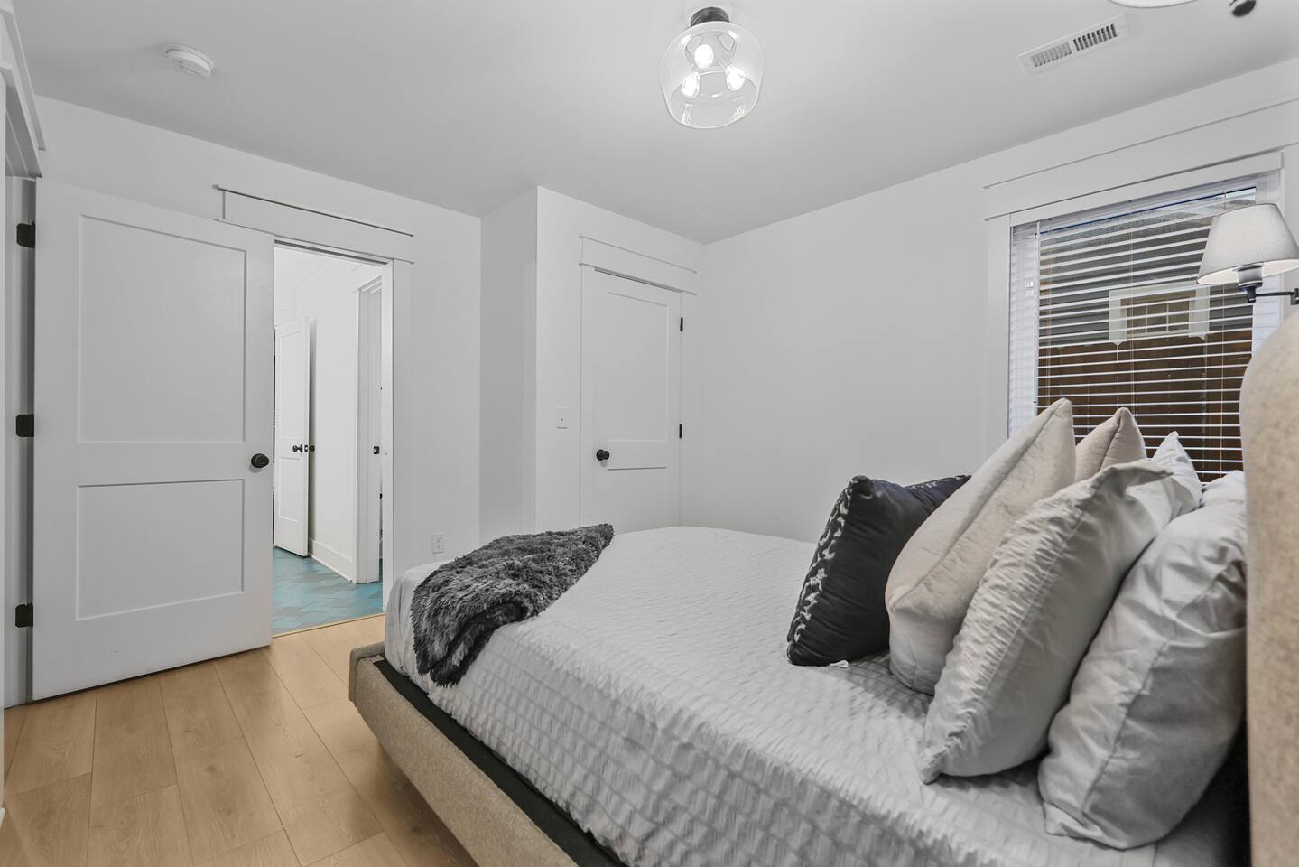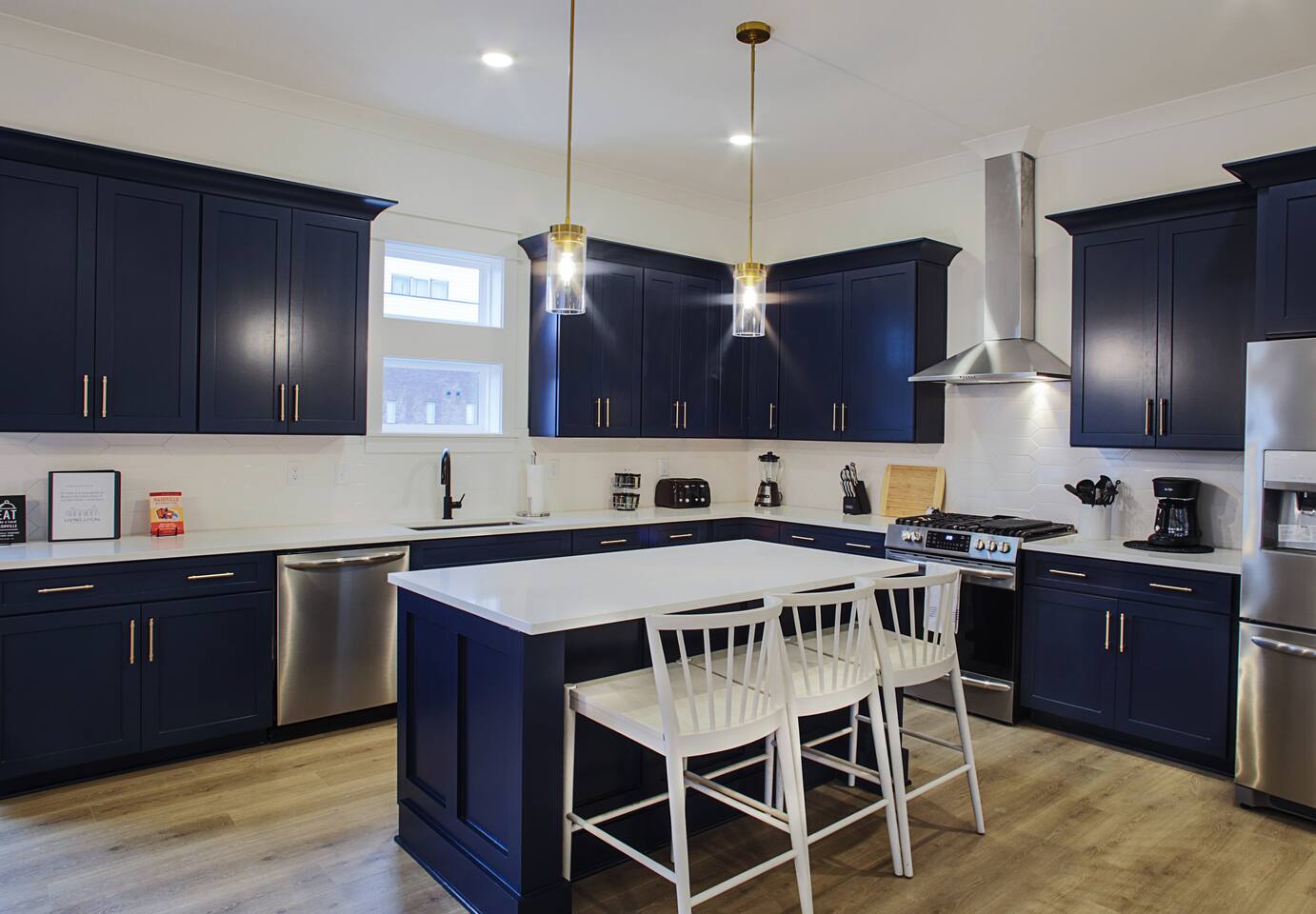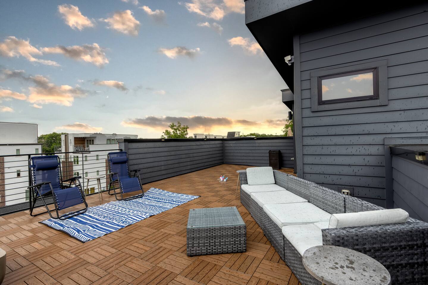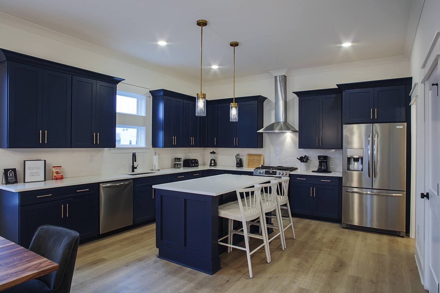 The artwork in the unit is all local artists! We love to support our friends and community. ✔️The first floor has two queen bedrooms and one bath. ✔️Take the flight of stairs up to the main quarters and you’ll find a fully equipped chefs kitchen, a six person designer wood table to dine, and an expansive living area. ✔️Take the next flight of stairs up to the third-floor where you will find a queen bedroom with a bathroom, a king master with an en suite bathroom. ✔️Take some selfie‘s or group photos in front of our Nashville selfie wall! ✔️Enjoy the rooftop feels and views as you make your way to the fourth floor. Here you can enjoy a game of cod hole or ring toss!