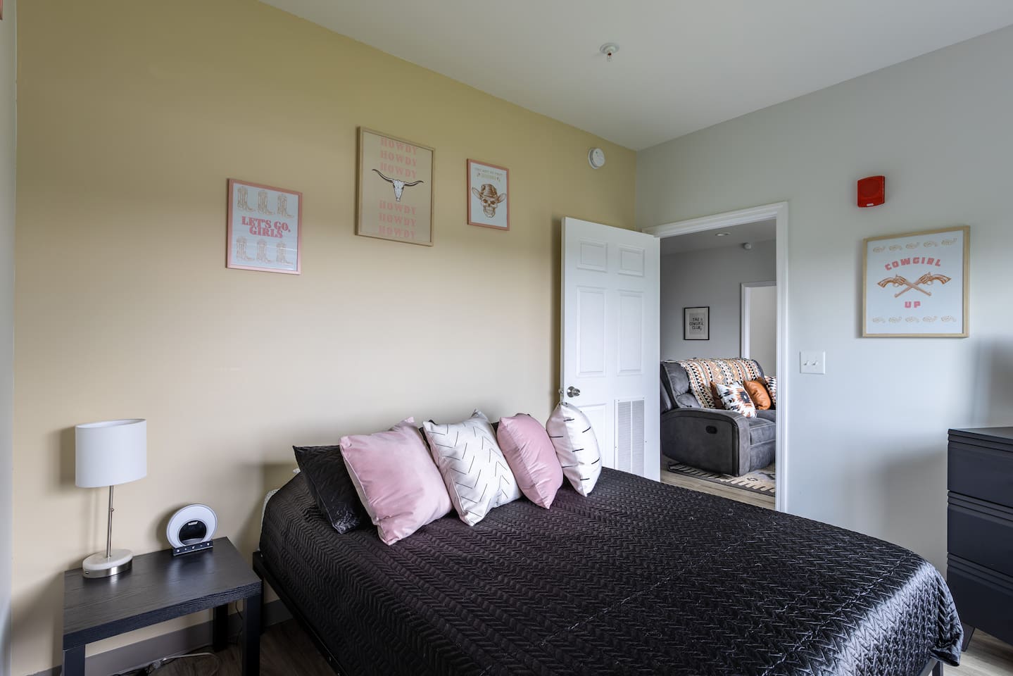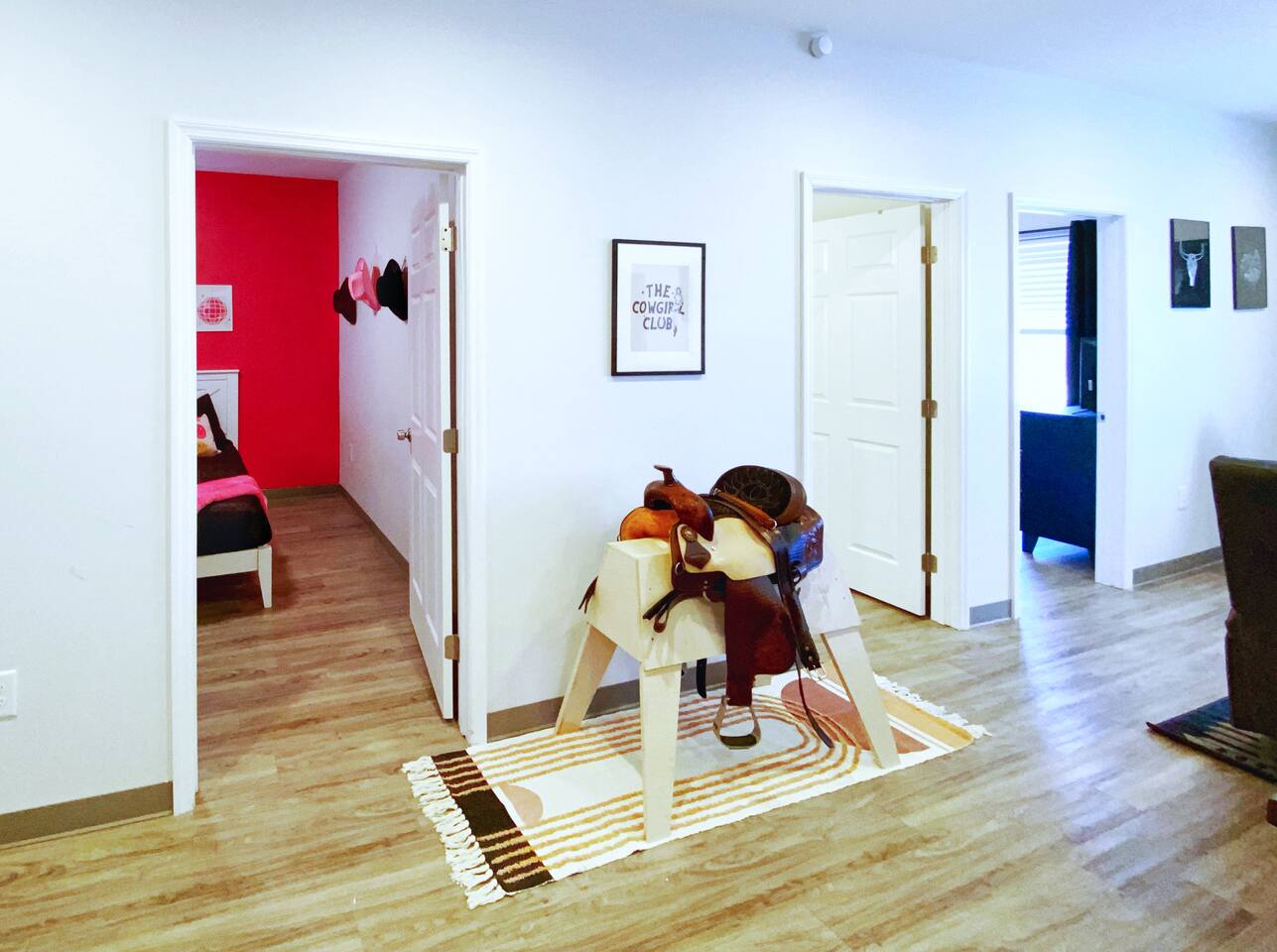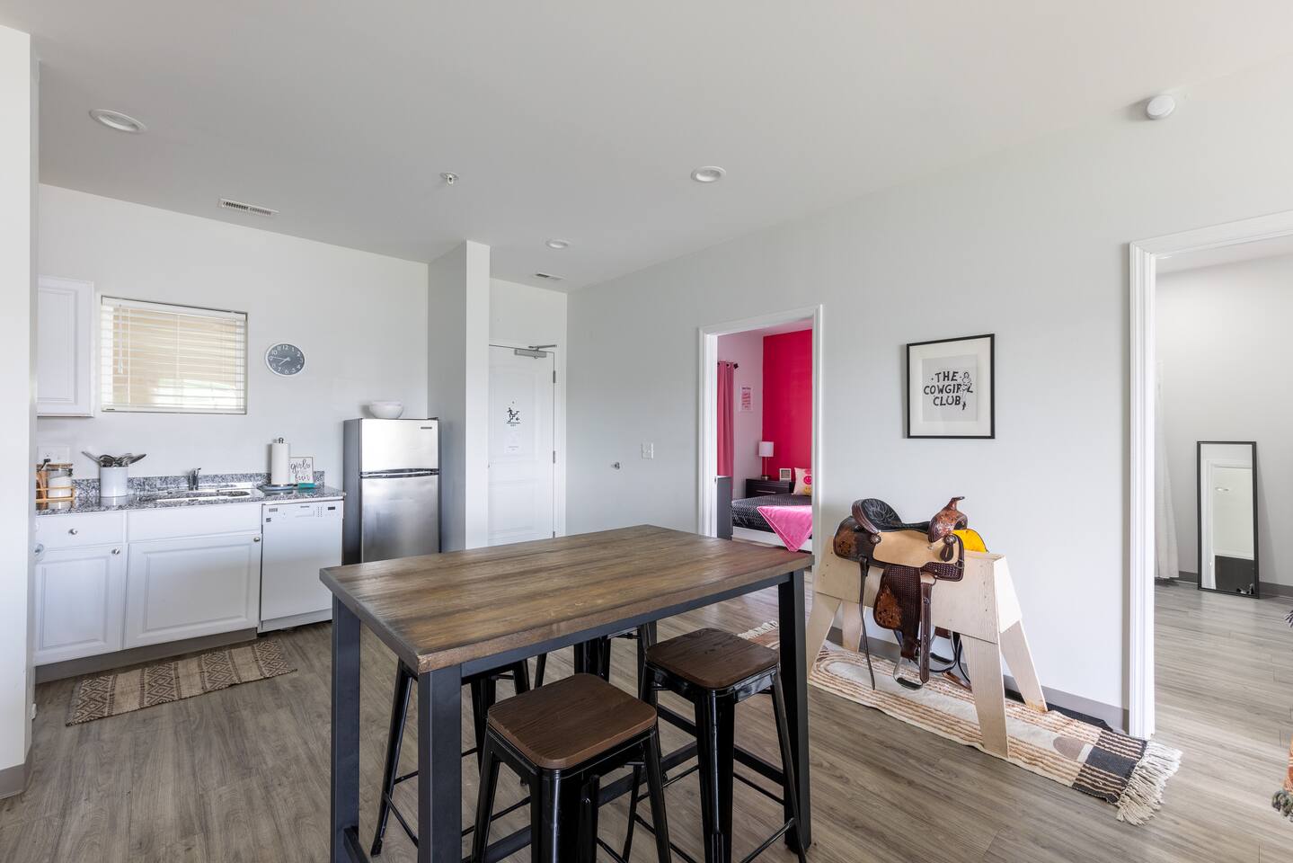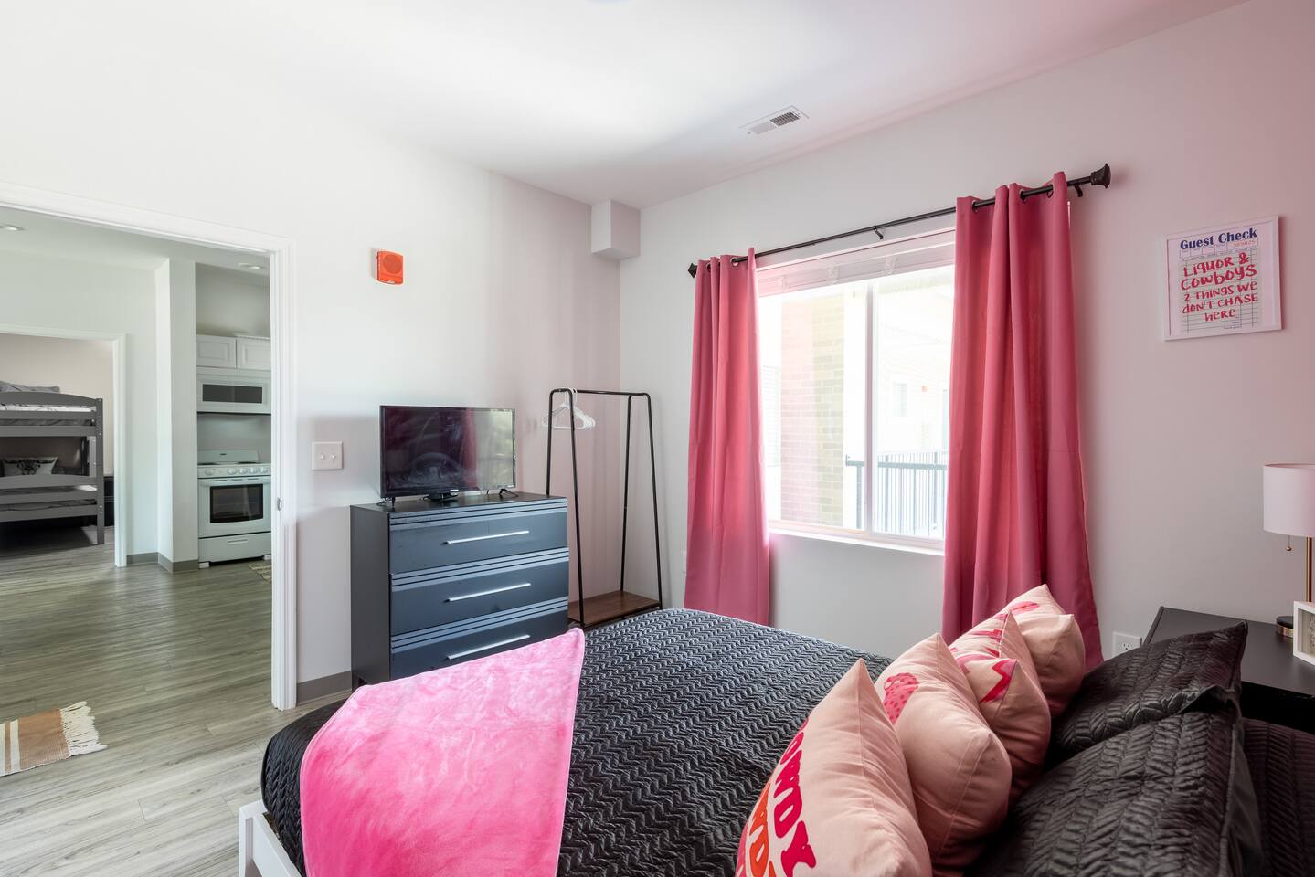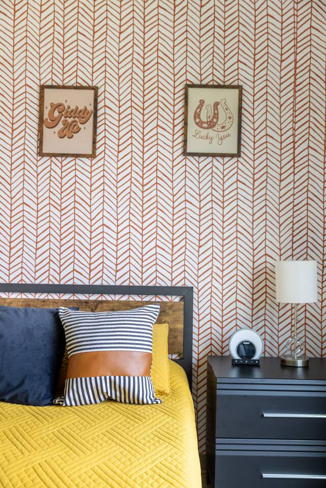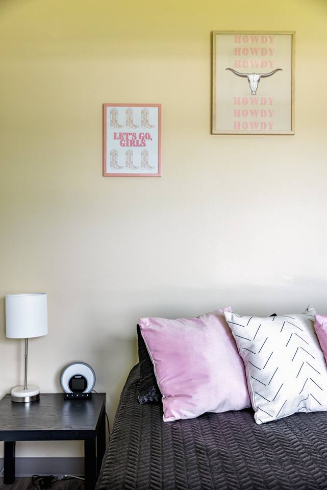 The Suite: Giddy Up Cowgirls (and boys)! We love to keep it country. Come take selfies on the saddle, enjoy the vibrant colors + bright space in all 4 rooms! ->Bedroom 1 "Cowboys + Tequila Please" : twin bunk beds | 1 single bunk ->Bedroom 2 "Giddy Up Cowgirl": Queen memory foam bed ->Bedroom 3 "Cowgirl Up" : Queen memory foam bed ->Bedroom 4 "Disco Cowgirl in Pink" : Queen memory foam bed *all bedrooms have smart tvs, alarm clocks (who needs em tho, right??), noise machines for that extra comfortable sleep *living area and select bedrooms have cable tv *kitchenette's have the perfect mini kitchen for your stay including; an oven, stovetop, dishwasher, fridge + most importantly.. a coffee maker:) *both bathrooms are shower only, no tubs *linens, towels, its all provided <-this is a THIRD floor unit, there are stairs->