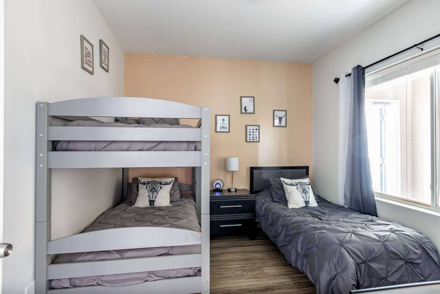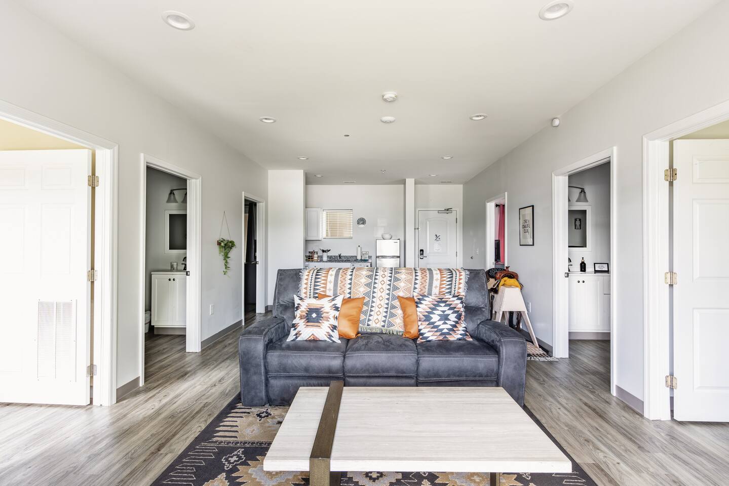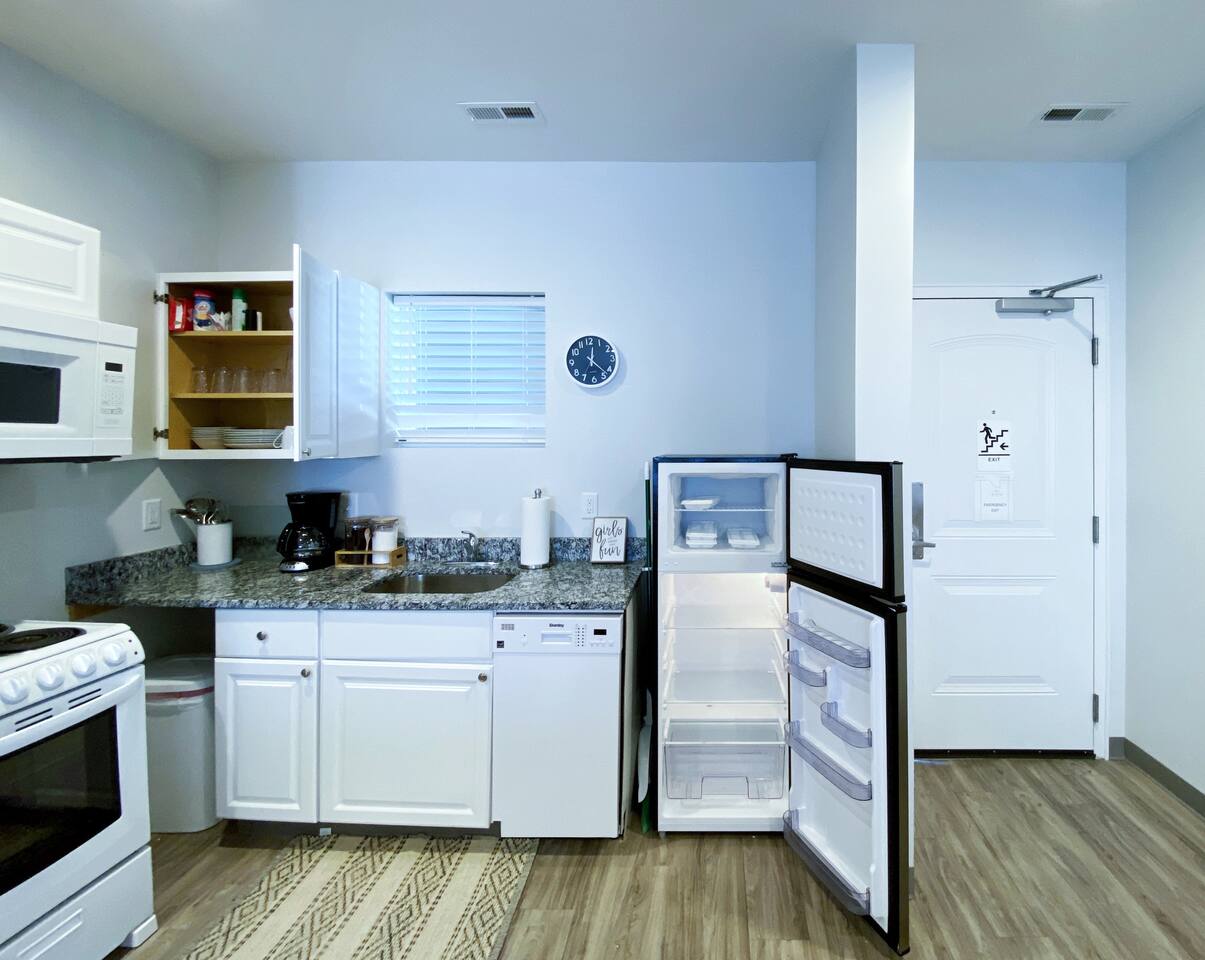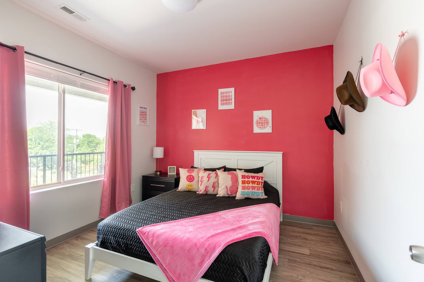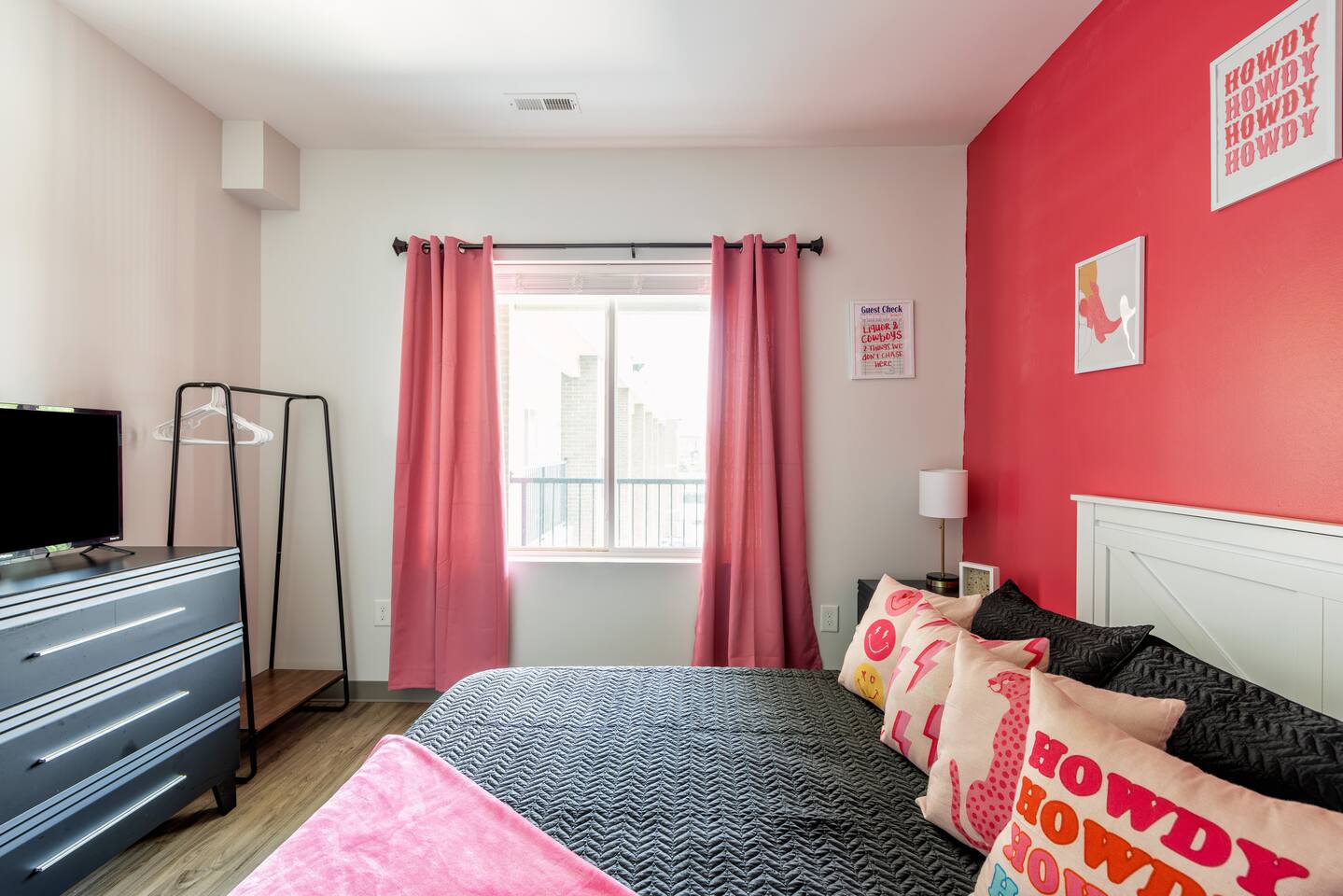 The Suite: Giddy Up Cowgirls (and boys)! We love to keep it country. Come take selfies on the saddle, enjoy the vibrant colors + bright space in all 4 rooms! ->Bedroom 1 "Cowboys + Tequila Please" : twin bunk beds | 1 single bunk ->Bedroom 2 "Giddy Up Cowgirl": Queen memory foam bed ->Bedroom 3 "Cowgirl Up" : Queen memory foam bed ->Bedroom 4 "Disco Cowgirl in Pink" : Queen memory foam bed *all bedrooms have smart tvs, alarm clocks (who needs em tho, right??), noise machines for that extra comfortable sleep *living area and select bedrooms have cable tv *kitchenette's have the perfect mini kitchen for your stay including; an oven, stovetop, dishwasher, fridge + most importantly.. a coffee maker:) *both bathrooms are shower only, no tubs *linens, towels, its all provided <-this is a THIRD floor unit, there are stairs->