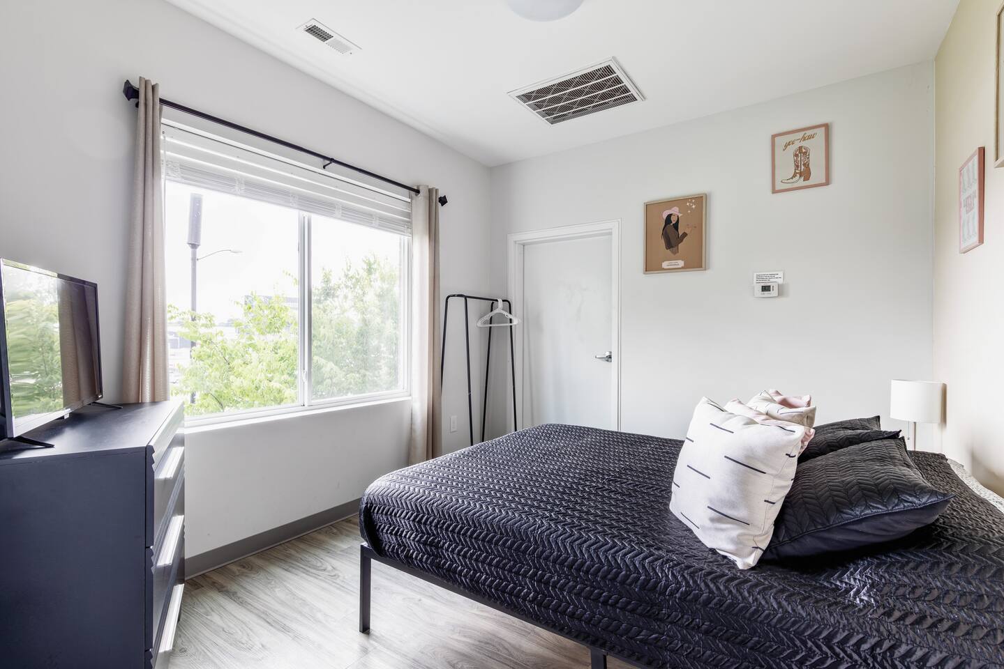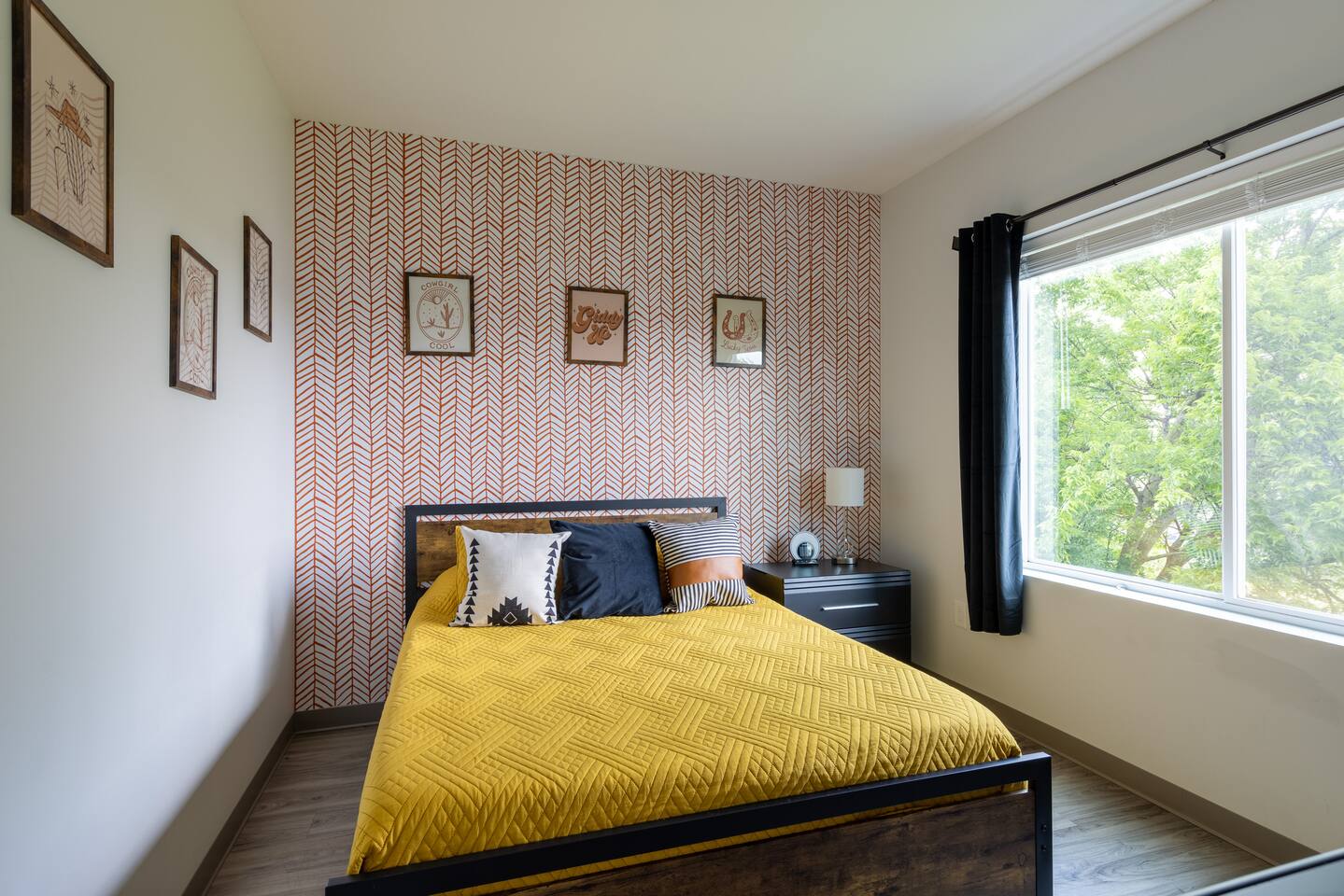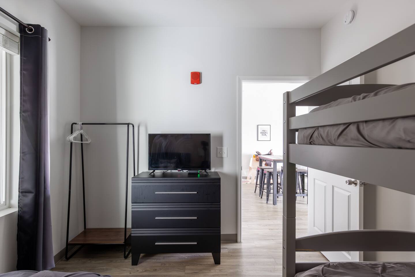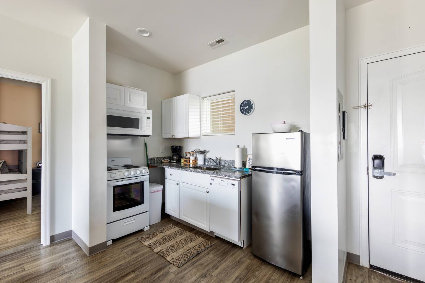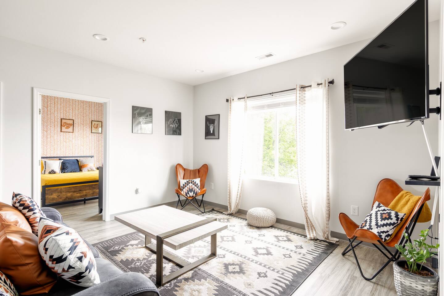 The Suite: Giddy Up Cowgirls (and boys)! We love to keep it country. Come take selfies on the saddle, enjoy the vibrant colors + bright space in all 4 rooms! ->Bedroom 1 "Cowboys + Tequila Please" : twin bunk beds | 1 single bunk ->Bedroom 2 "Giddy Up Cowgirl": Queen memory foam bed ->Bedroom 3 "Cowgirl Up" : Queen memory foam bed ->Bedroom 4 "Disco Cowgirl in Pink" : Queen memory foam bed *all bedrooms have smart tvs, alarm clocks (who needs em tho, right??), noise machines for that extra comfortable sleep *living area and select bedrooms have cable tv *kitchenette's have the perfect mini kitchen for your stay including; an oven, stovetop, dishwasher, fridge + most importantly.. a coffee maker:) *both bathrooms are shower only, no tubs *linens, towels, its all provided <-this is a THIRD floor unit, there are stairs->