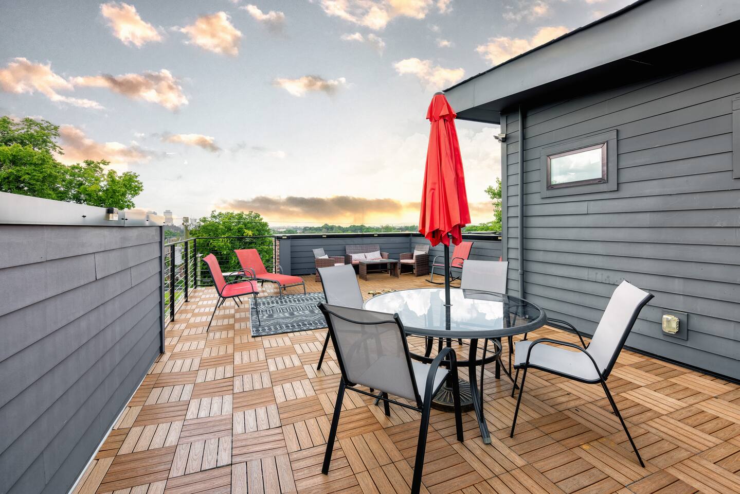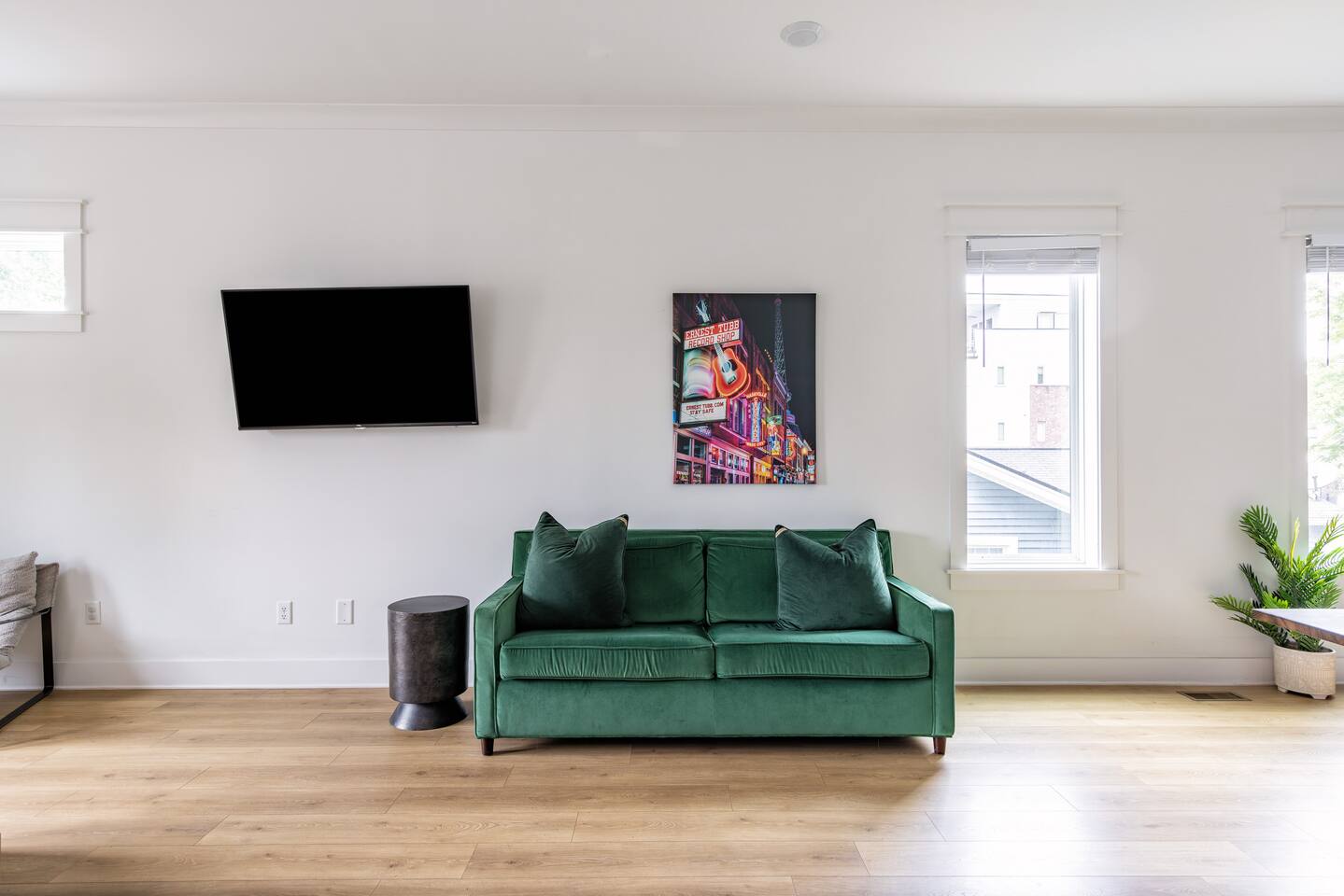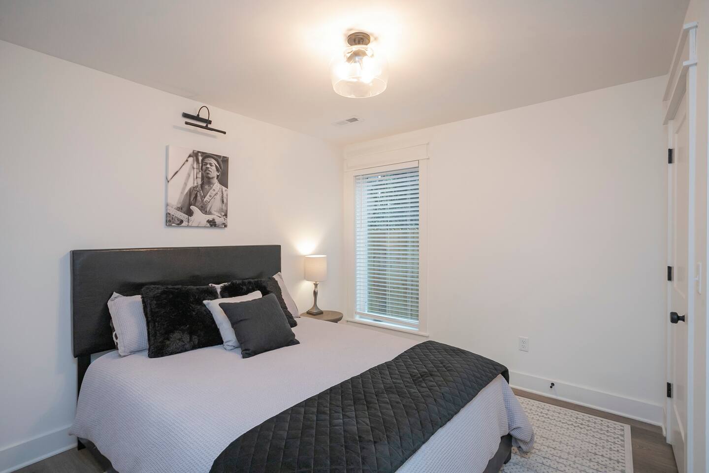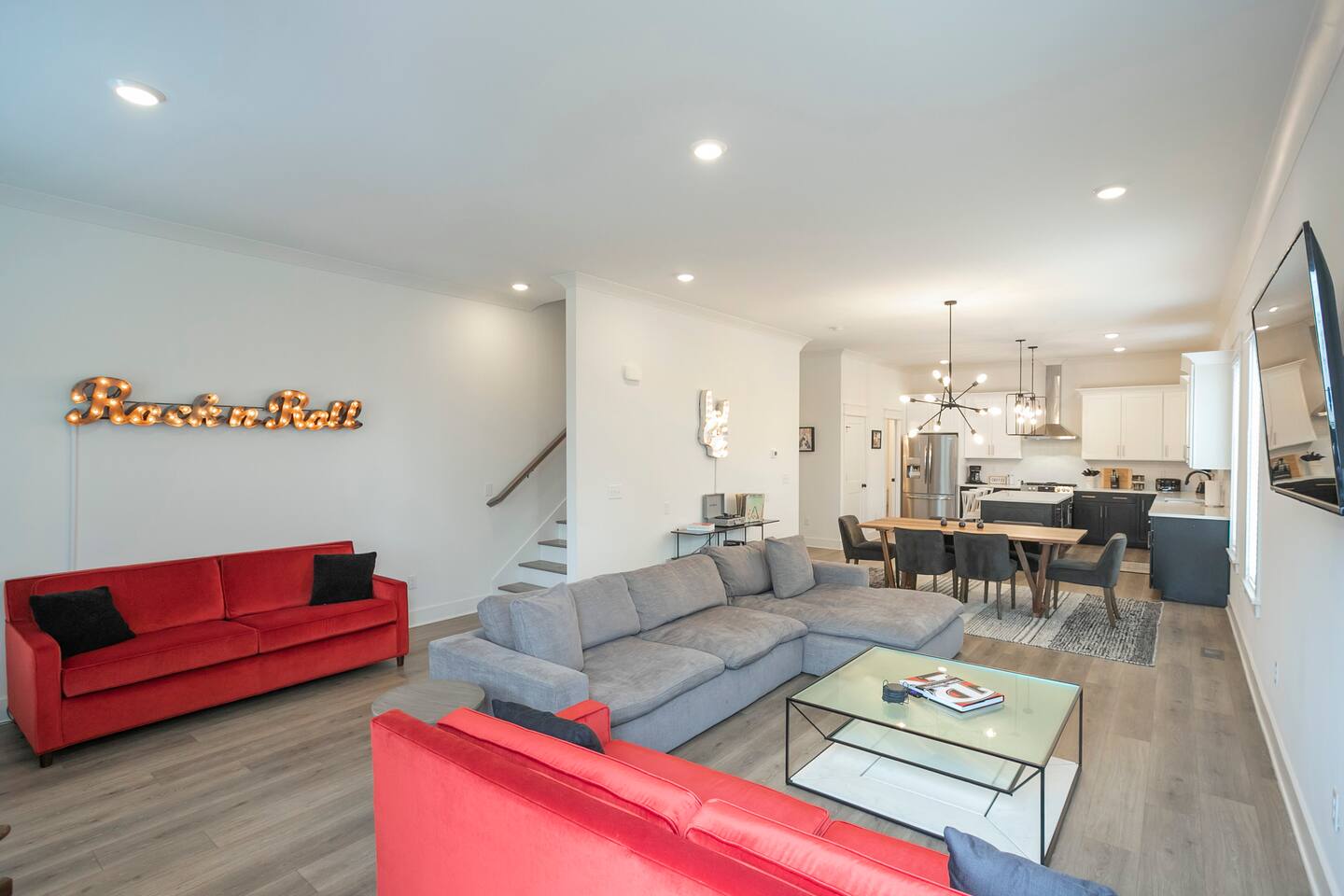 "Rock + Roll Haven" Rock + Roll Haven: 1st Floor: ->"the Bowie" Queen bed + Roku TV ->Shared bath (shower only) ->"the Hendrix" Queen Bed 2nd Floor: ->Main Living Area w/ 2 fold out queen sleeper sofas ->full kitchen ->6 person dining 3rd Floor: ->"icons of the 90s" Queen bed + ensuite bath ->"the Beatles" Master King bed w/ Roku TV + ensuite bath Rooftop! ->Enjoy the birds eye view to downtown! You can see the city line clearly. ->Cornhole, Ring Toss, Darts to play ------ "The Nash Local" The artwork in the unit is all local artists! We love to support our friends and community. Try the local Nash coffees we have also! ✔️The first floor has two queen bedrooms and one bath. ✔️Take the flight of stairs up to the main quarters and you’ll find a fully equipped chefs kitchen, a six person designer wood table to dine, and an expansive living area. ✔️Take the next flight of stairs up to the third-floor where you will find a queen bedroom with a bathroom, a king master with an en suite bathroom. ✔️Take some selfie‘s or group photos in front of our Nashville selfie wall! ✔️Enjoy the rooftop feels and views as you make your way to the fourth floor. Here you can enjoy a game of cod hole or ring toss!